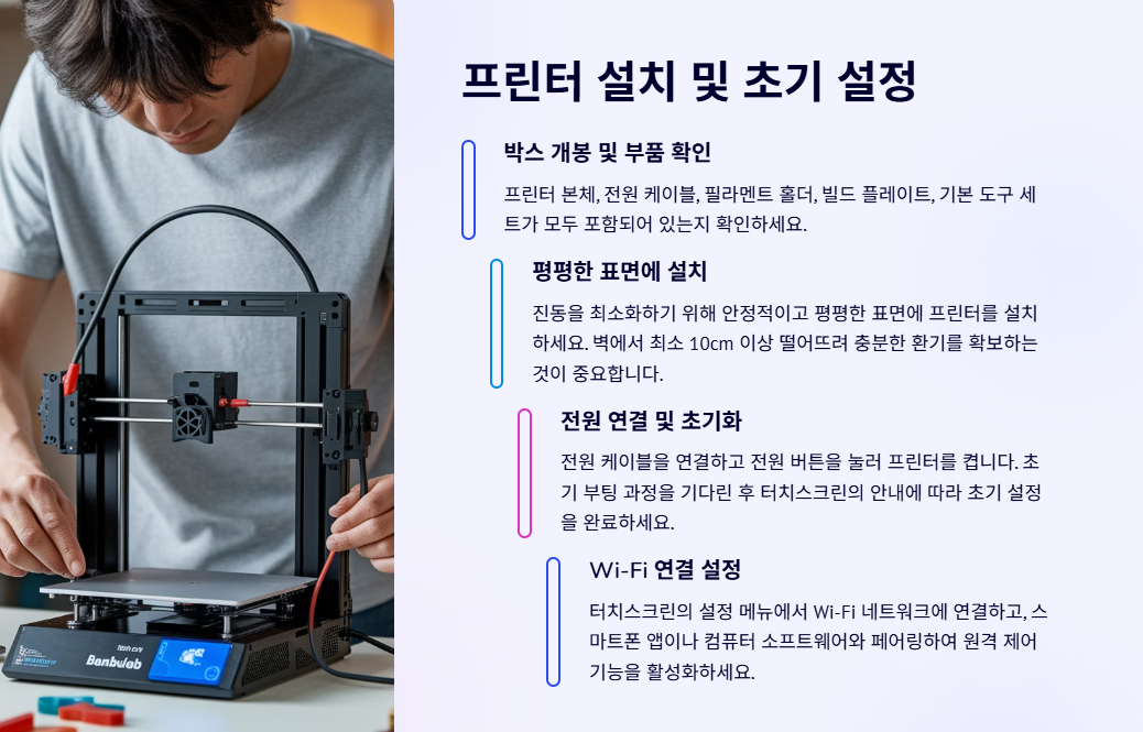 - 박스 개봉 및 부품 확인 : 프린터 본체, 전원 케이블, 필라멘트 홀더, 빌드 플레이트, 기본 도구 세트가 모두 포함되어 있는지 확인하세요.