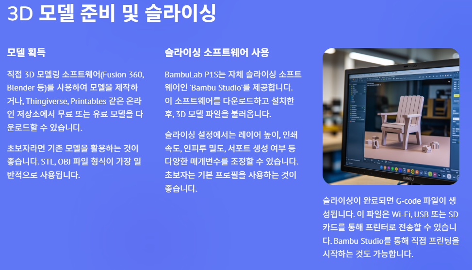 초보자라면 기존 모델을 활용하는 것이 좋습니다. STL, OBJ 파일 형식이 가장 일반적으로 사용됩니다.