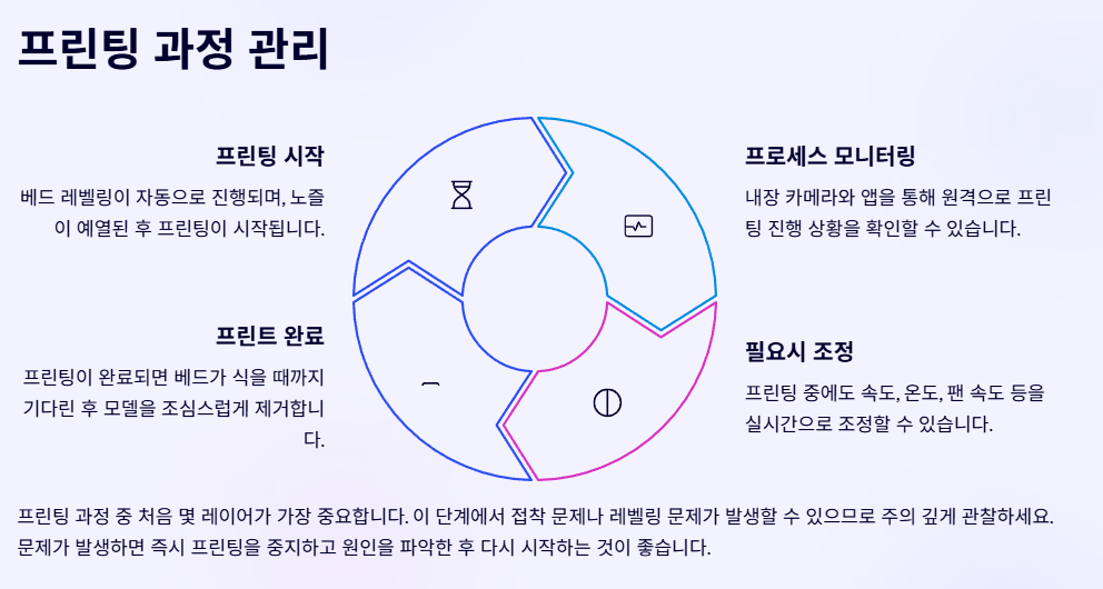 프린팅 과정 중 처음 몇 레이어가 가장 중요합니다. 이 단계에서 접착 문제나 레벨링 문제가 발생할 수 있으므로 주의 깊게 관찰하세요. 문제가 발생하면 즉시 프린팅을 중지하고 원인을 파악한 후 다시 시작하는 것이 좋습니다.