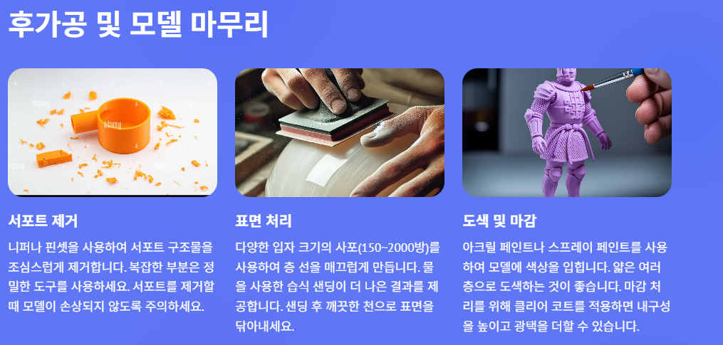 니퍼나 핀셋을 사용하여 서포트 구조물을 조심스럽게 제거합니다. 복잡한 부분은 정밀한 도구를 사용하세요. 서포트를 제거할 때 모델이 손상되지 않도록 주의하세요.