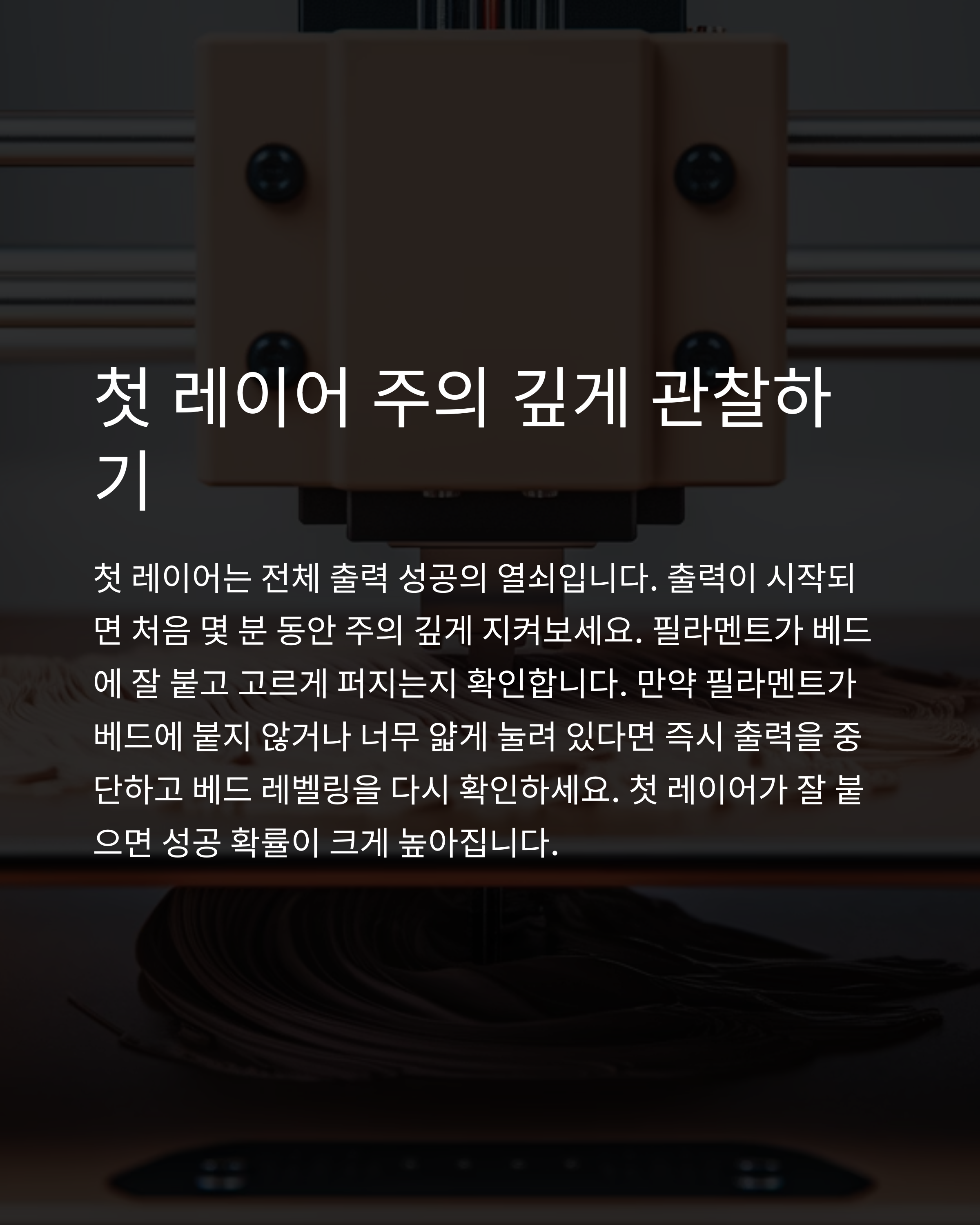첫 레이어는 전체 출력 성공의 열쇠입니다. 출력이 시작되면 처음 몇 분 동안 주의 깊게 지켜보세요. 필라멘트가 베드에 잘 붙고 고르게 퍼지는지 확인합니다. 만약 필라멘트가 베드에 붙지 않거나 너무 얇게 눌려 있다면 즉시 출력을 중단하고 베드 레벨링을 다시 확인하세요. 첫 레이어가 잘 붙으면 성공 확률이 크게 높아집니다.