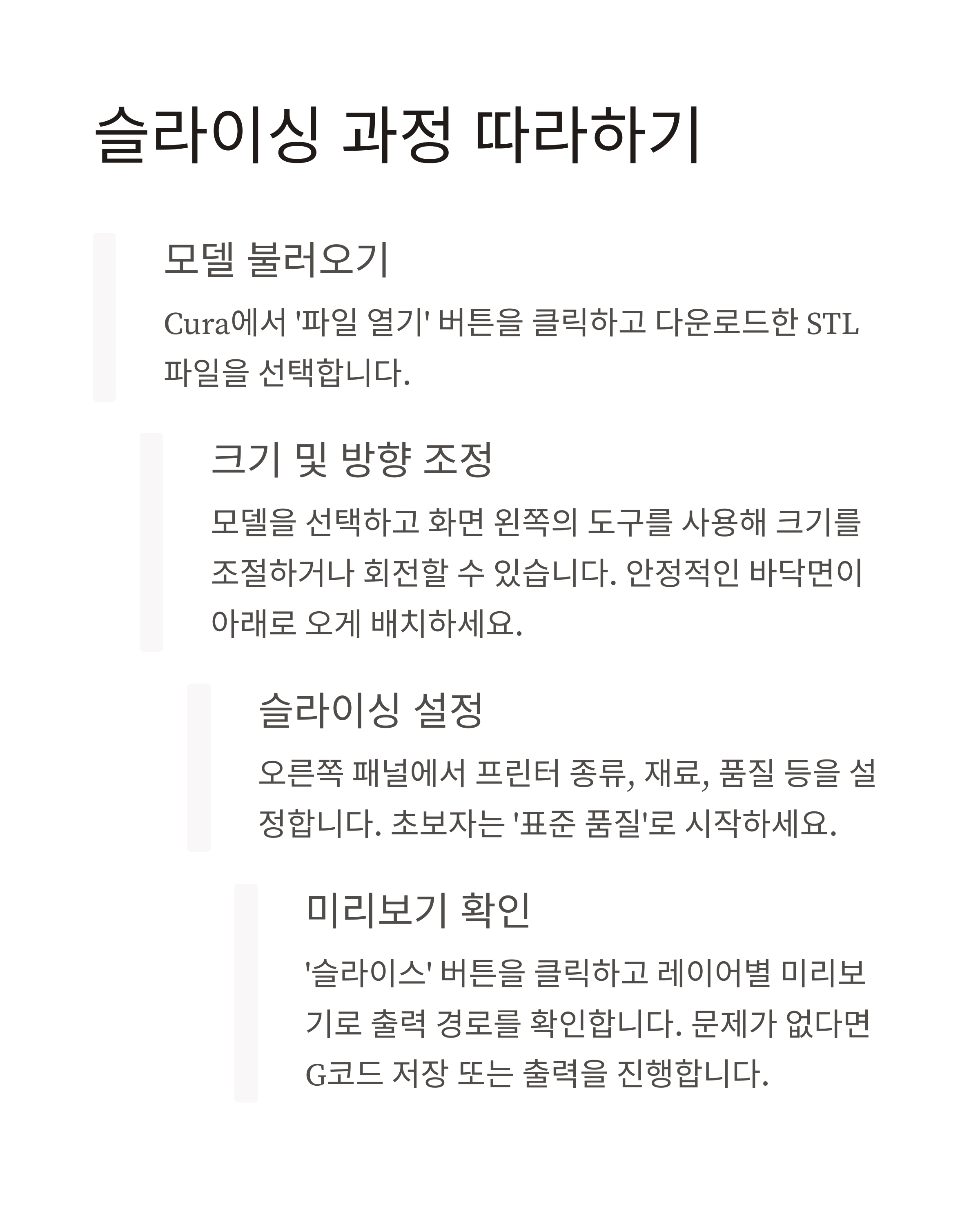 슬라이서는 3D 모델(STL 파일)을 프린터가 이해할 수 있는 G코드로 변환하는 필수 소프트웨어입니다. 초보자에게 추천하는 슬라이서는 무료로 사용 가능한 Ultimaker Cura입니다. Cura 홈페이지에서 최신 버전을 다운로드하여 설치하세요. 처음 실행 시 사용할 프린터 모델을 선택하면 기본 설정값이 자동으로 적용됩니다.