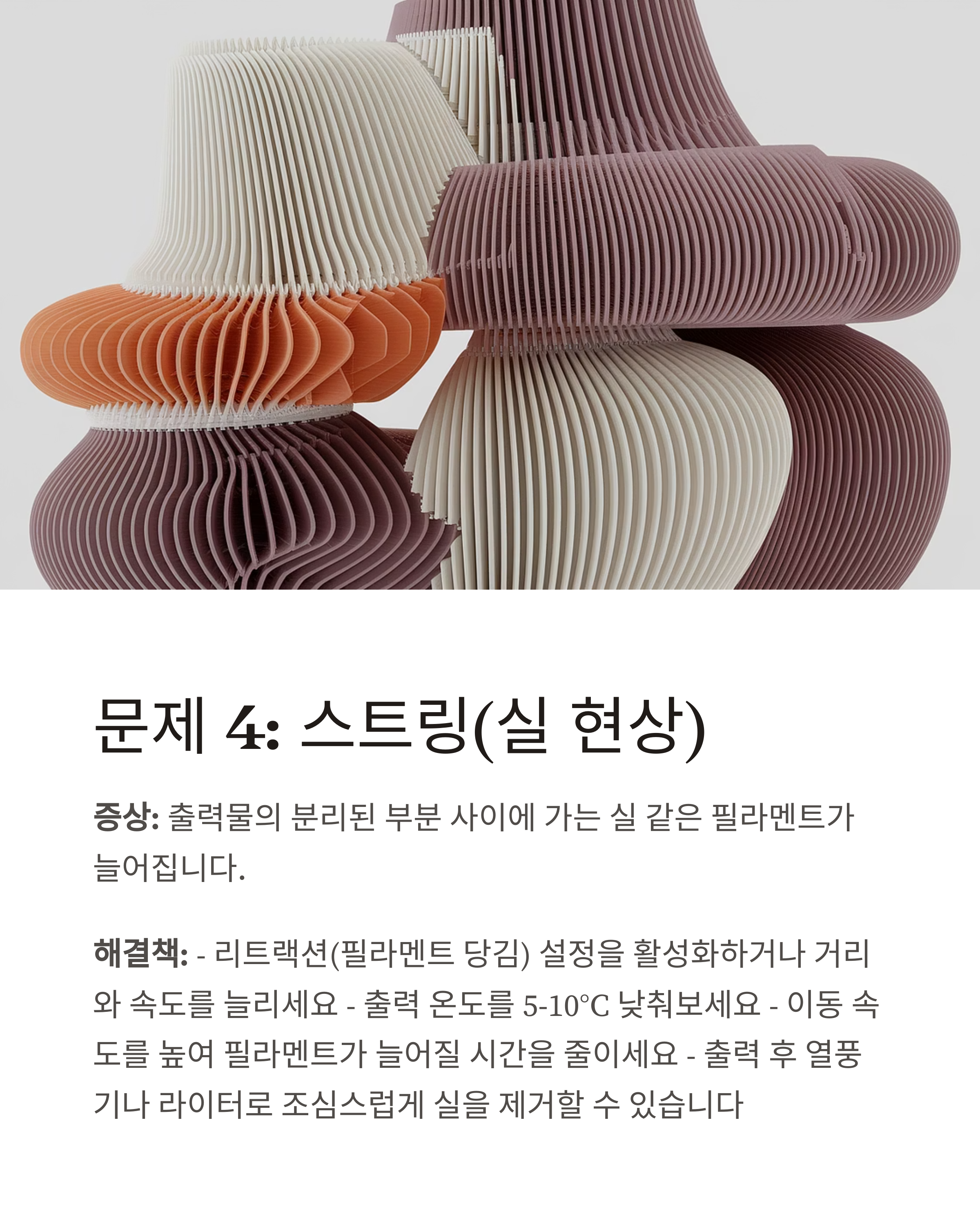 해결책: - 리트랙션(필라멘트 당김) 설정을 활성화하거나 거리와 속도를 늘리세요 - 출력 온도를 5-10°C 낮춰보세요 - 이동 속도를 높여 필라멘트가 늘어질 시간을 줄이세요 - 출력 후 열풍기나 라이터로 조심스럽게 실을 제거할 수 있습니다