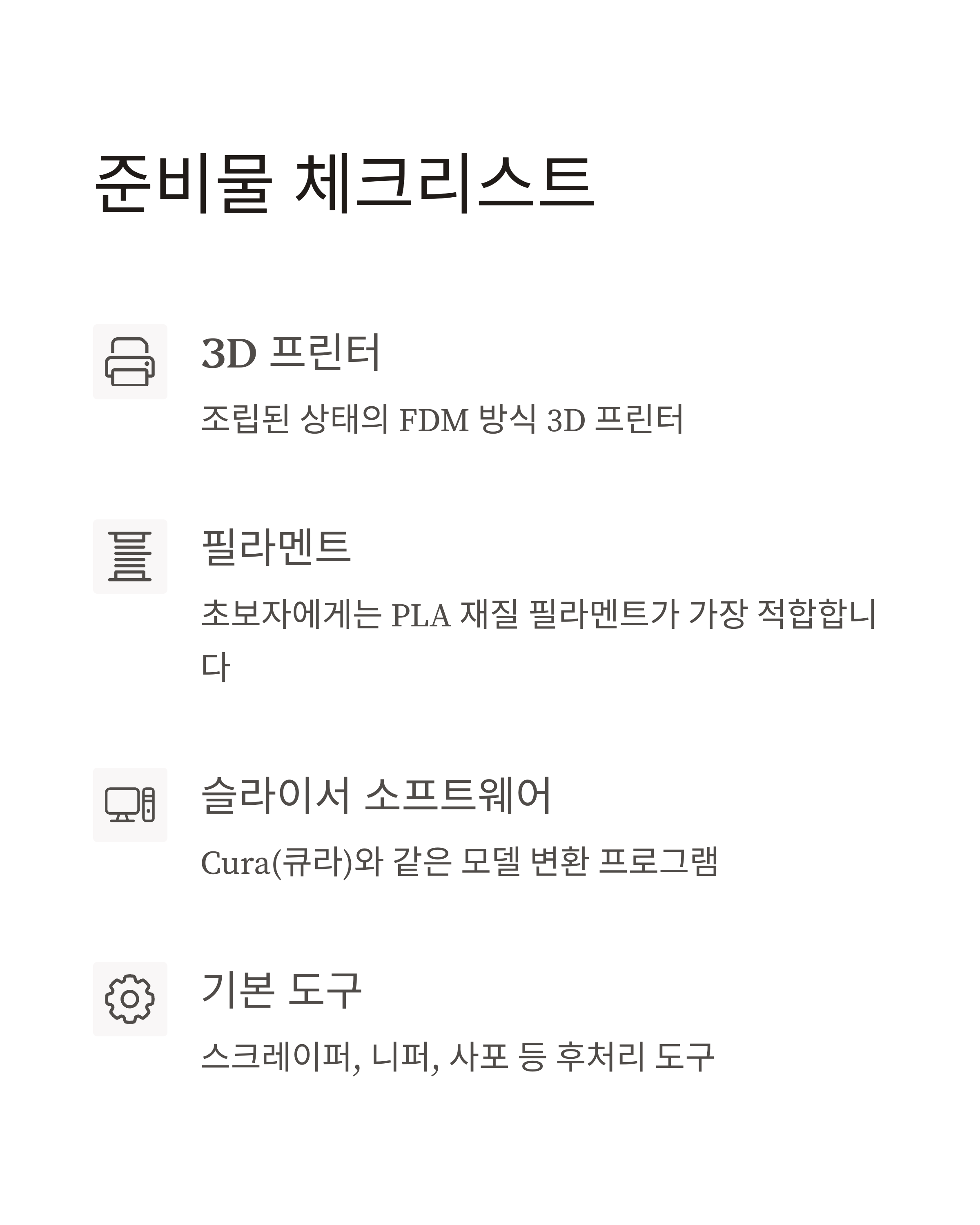 프린터 본체, 필라멘트, 전원케이블, 설명서 등 모든 구성품이 있는지 확인하세요. 누락된 부품이 있다면 구매처에 문의하세요.