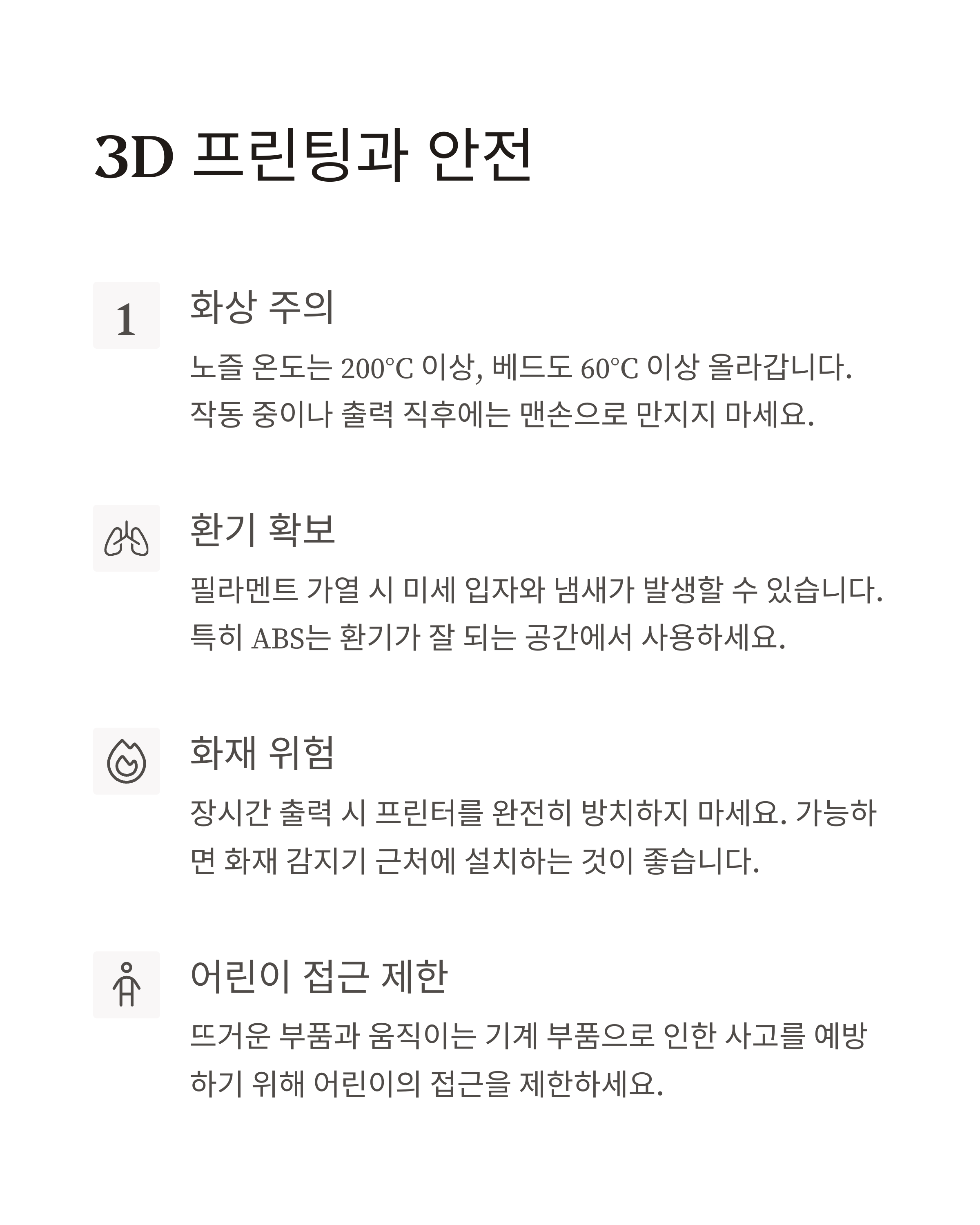 노즐 온도는 200°C 이상, 베드도 60°C 이상 올라갑니다. 작동 중이나 출력 직후에는 맨손으로 만지지 마세요.