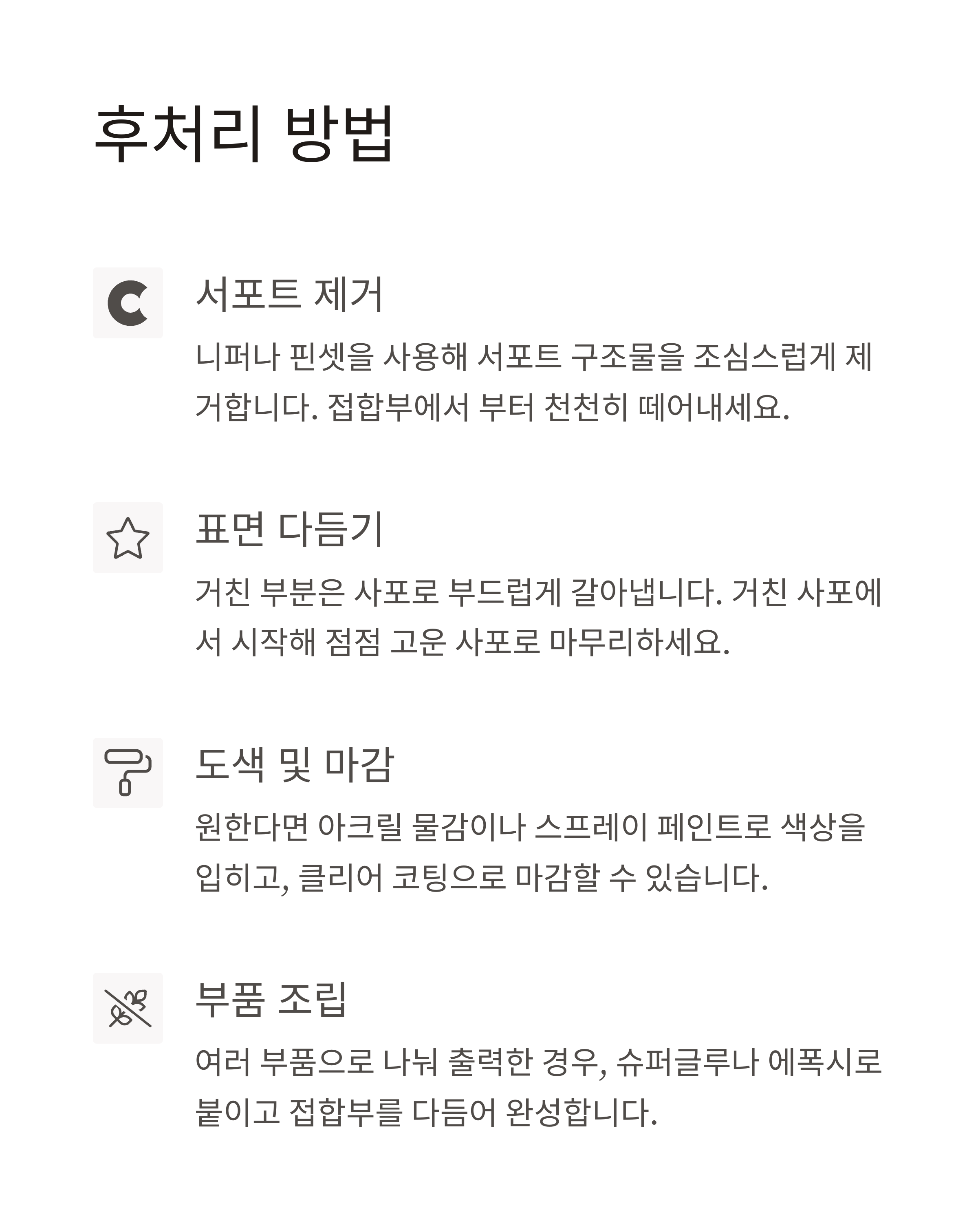 스크레이퍼, 니퍼, 사포 등 후처리 도구