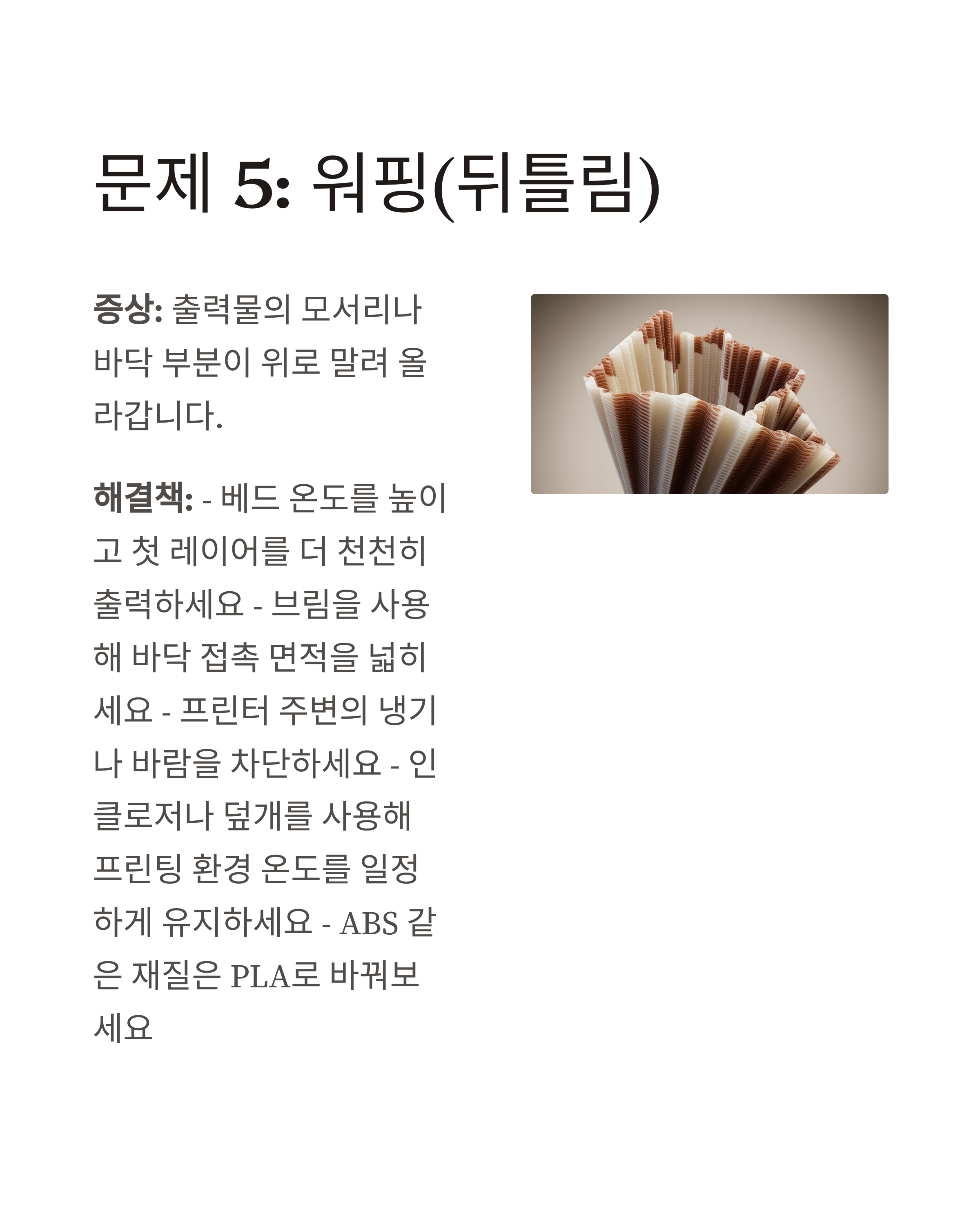 증상: 출력물의 모서리나 바닥 부분이 위로 말려 올라갑니다.