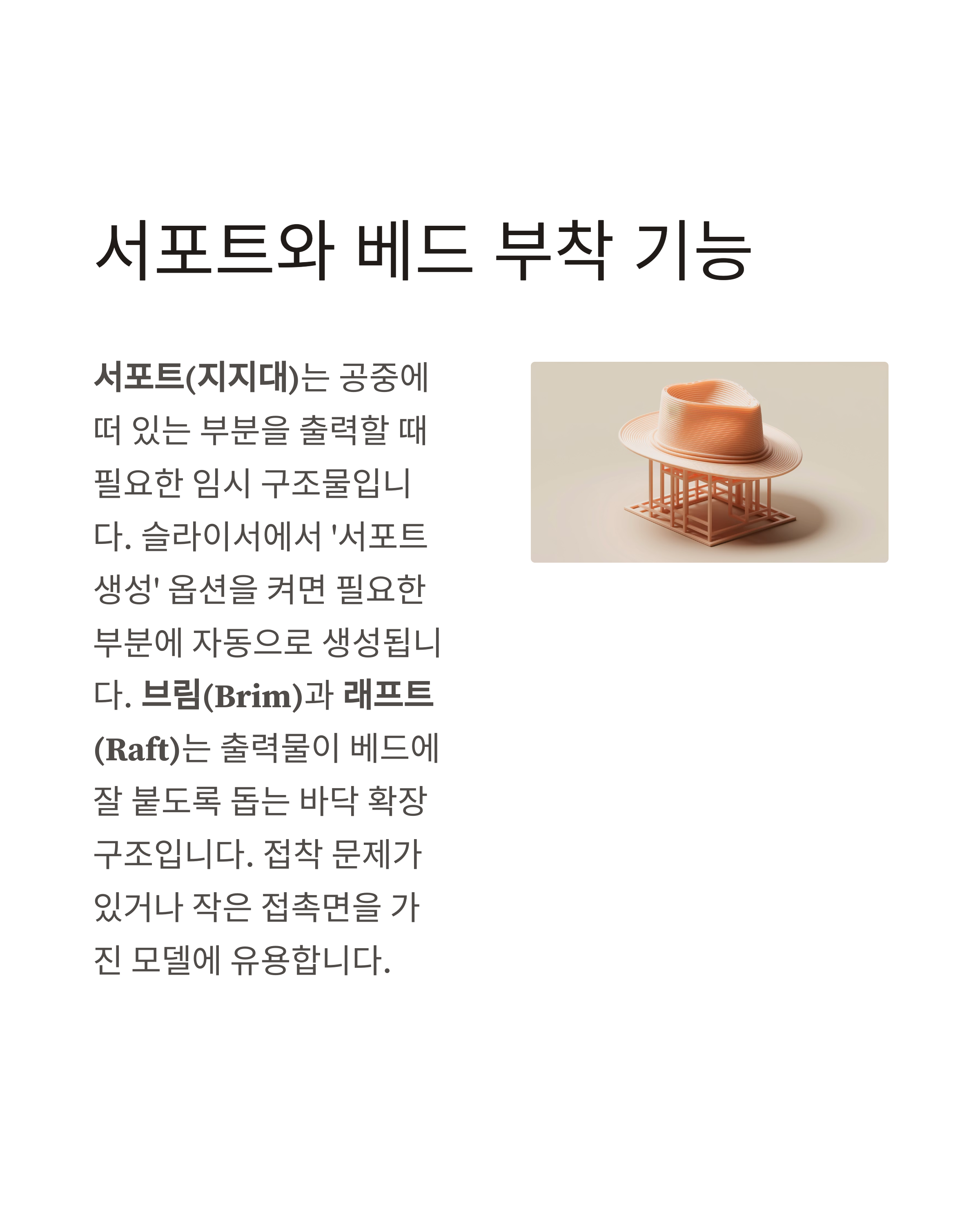 임시 구조물입니다. 슬라이서에서 '서포트 생성' 옵션을 켜면 필요한 부분에 자동으로 생성됩니다. 브림(Brim)과 래프트(Raft)는 출력물이 베드에 잘 붙도록 돕는 바닥 확장 구조입니다. 접착 문제가 있거나 작은 접촉면을 가진 모델에 유용합니다.