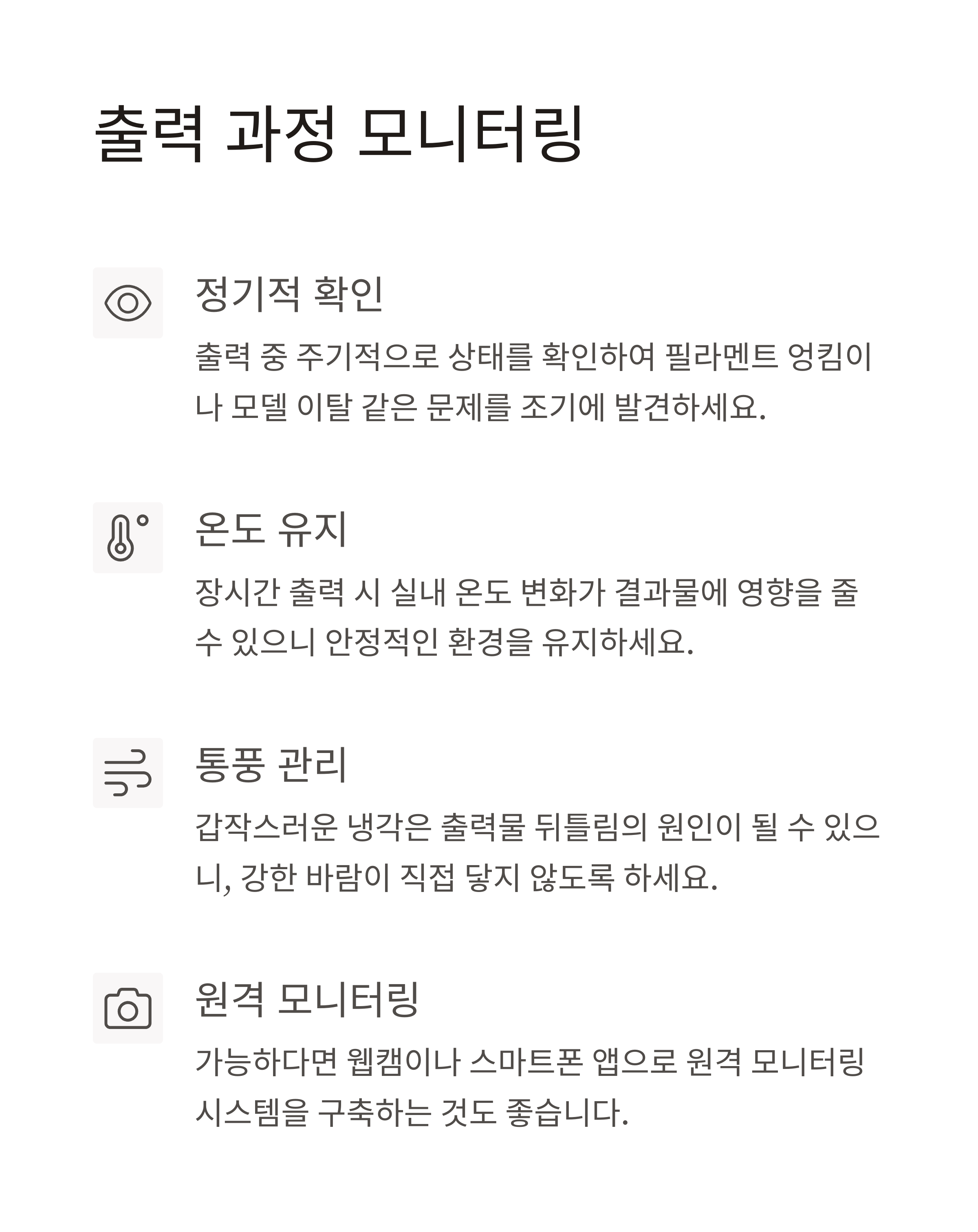 장시간 출력 시 실내 온도 변화가 결과물에 영향을 줄 수 있으니 안정적인 환경을 유지하세요.