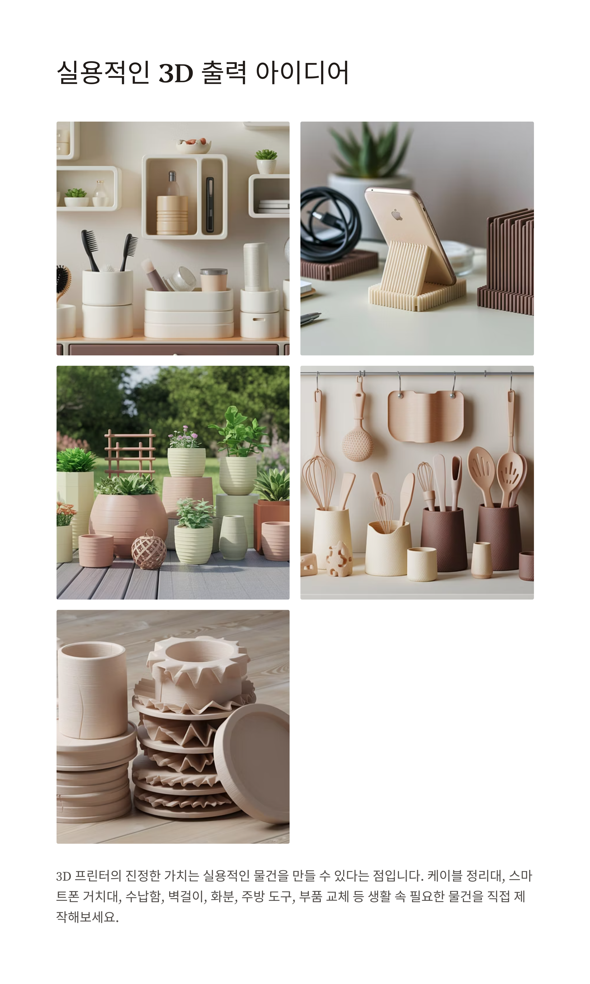 3D 프린터의 진정한 가치는 실용적인 물건을 만들 수 있다는 점입니다. 케이블 정리대, 스마트폰 거치대, 수납함, 벽걸이, 화분, 주방 도구, 부품 교체 등 생활 속 필요한 물건을 직접 제작해보세요.