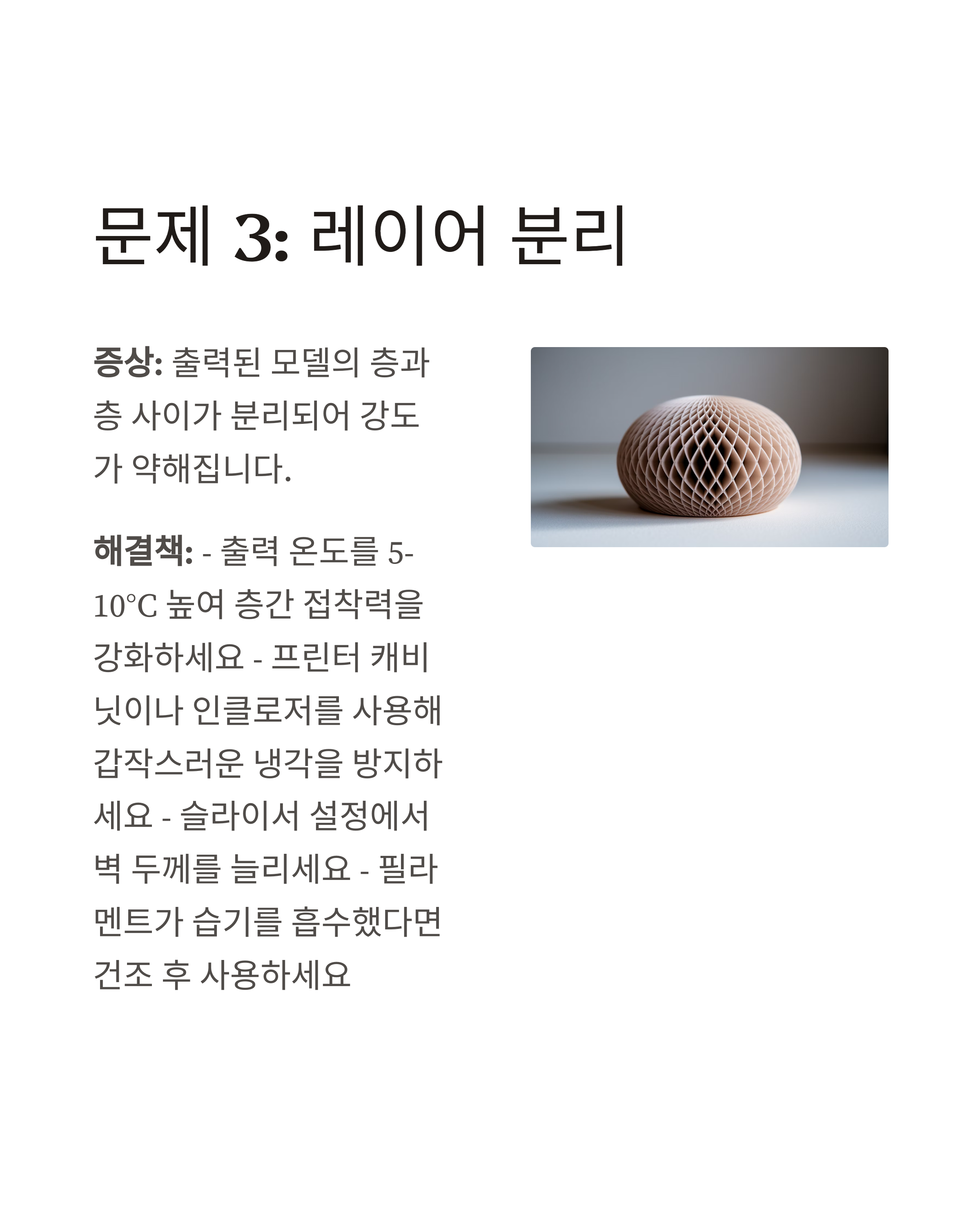 증상: 출력된 모델의 층과 층 사이가 분리되어 강도가 약해집니다.