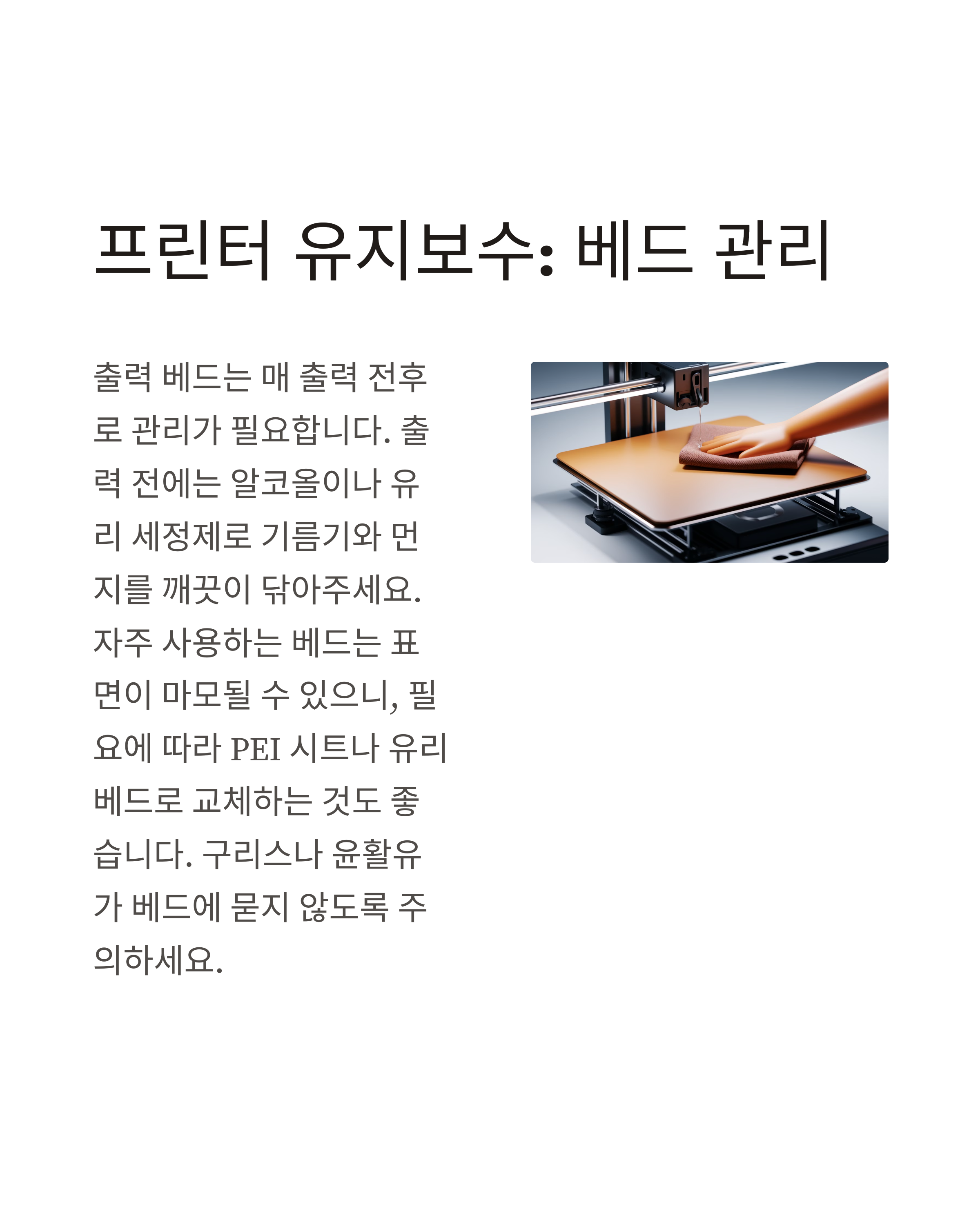 출력 베드는 매 출력 전후로 관리가 필요합니다.