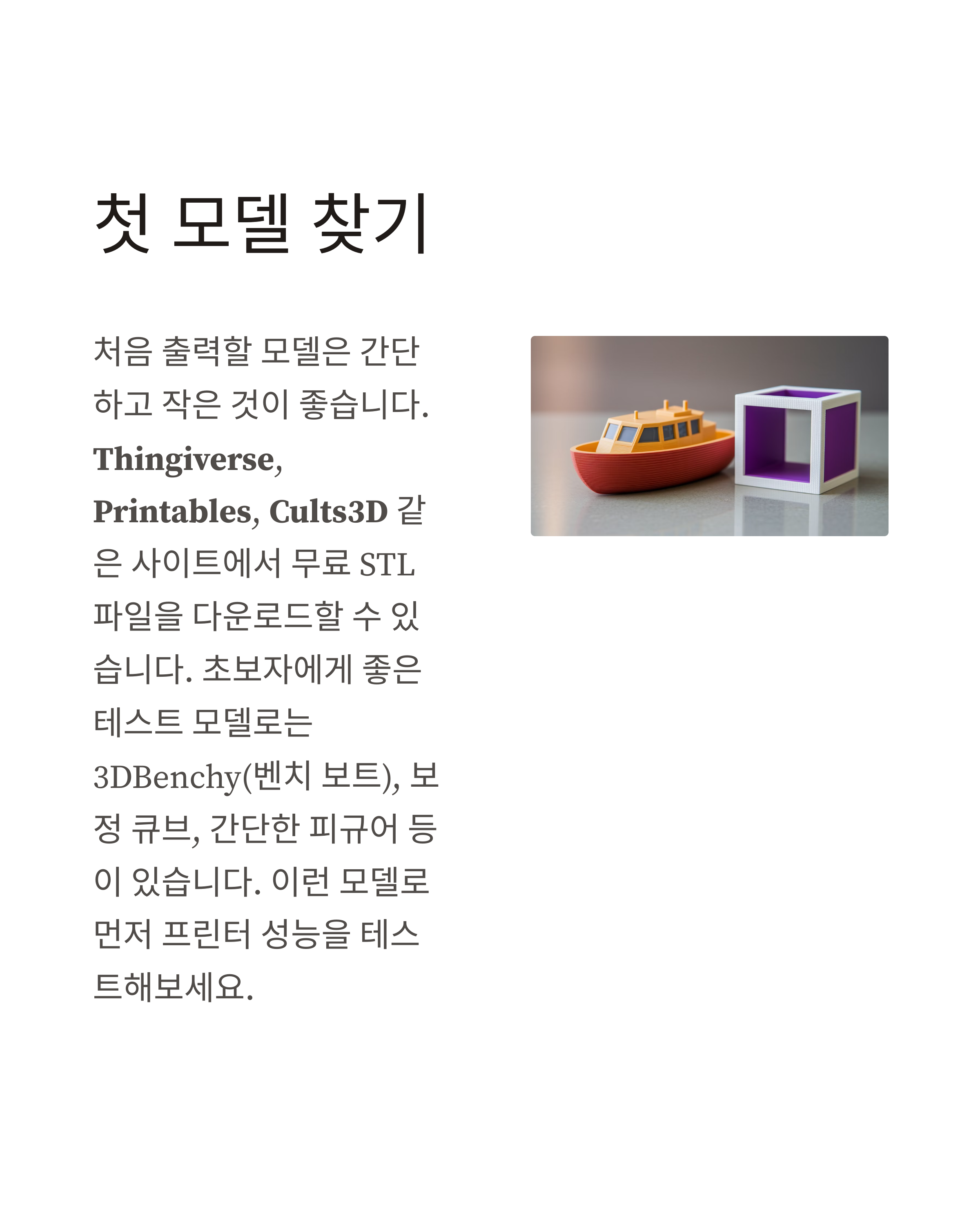 처음 출력할 모델은 간단하고 작은 것이 좋습니다. Thingiverse, Printables, Cults3D 같은 사이트에서 무료 STL 파일을 다운로드할 수 있습니다. 초보자에게 좋은 테스트 모델로는 3DBenchy(벤치 보트), 보정 큐브, 간단한 피규어 등이 있습니다. 이런 모델로 먼저 프린터 성능을 테스트해보세요.