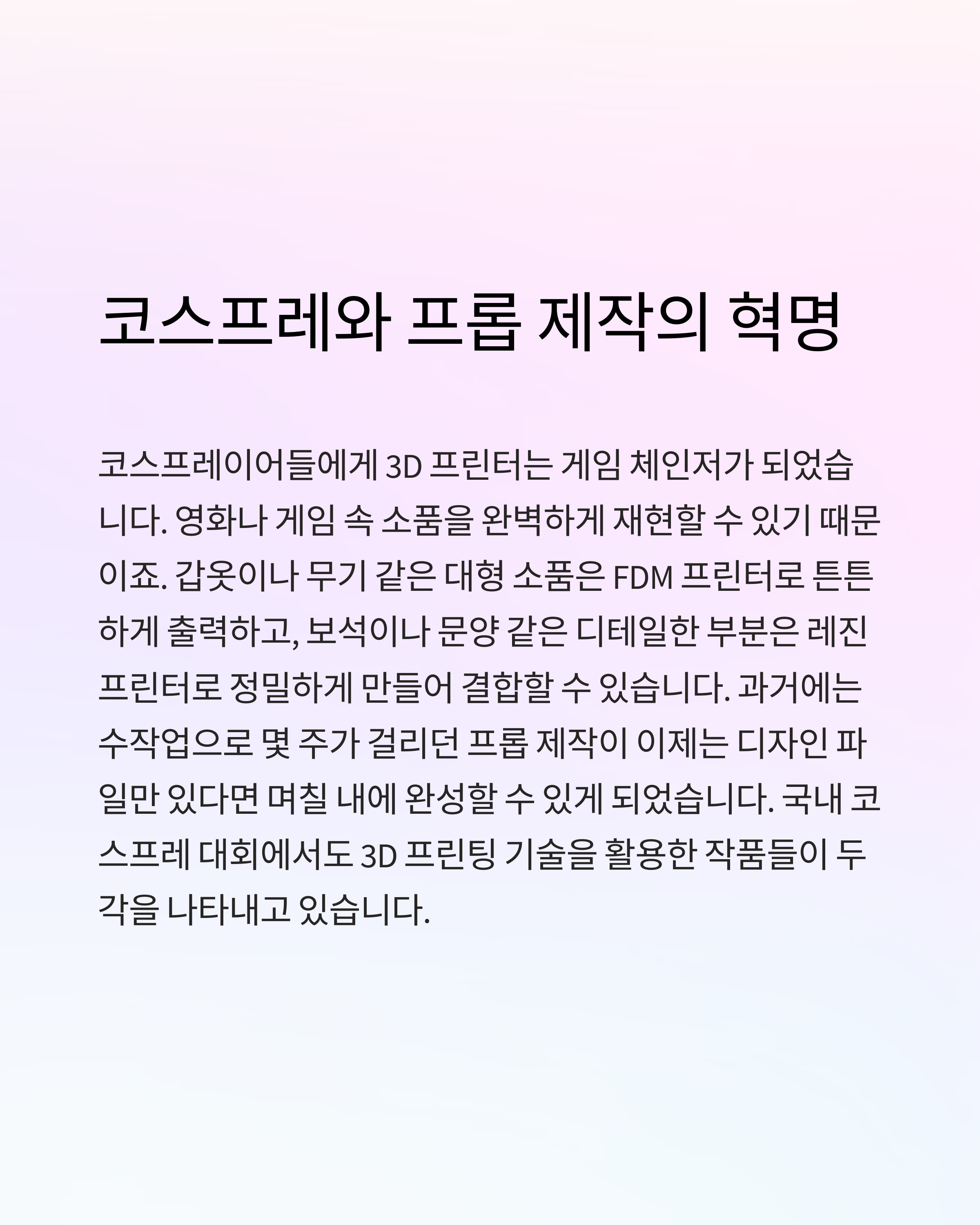 코스프레이어들에게 3D 프린터는 게임 체인저가 되었습니다. 영화나 게임 속 소품을 완벽하게 재현할 수 있기 때문이죠. 갑옷이나 무기 같은 대형 소품은 FDM 프린터로 튼튼하게 출력하고, 보석이나 문양 같은 디테일한 부분은 레진 프린터로 정밀하게 만들어 결합할 수 있습니다. 과거에는 수작업으로 몇 주가 걸리던 프롭 제작이 이제는 디자인 파일만 있다면 며칠 내에 완성할 수 있게 되었습니다. 국내 코스프레 대회에서도 3D 프린팅 기술을 활용한 작품들이 두각을 나타내고 있습니다.