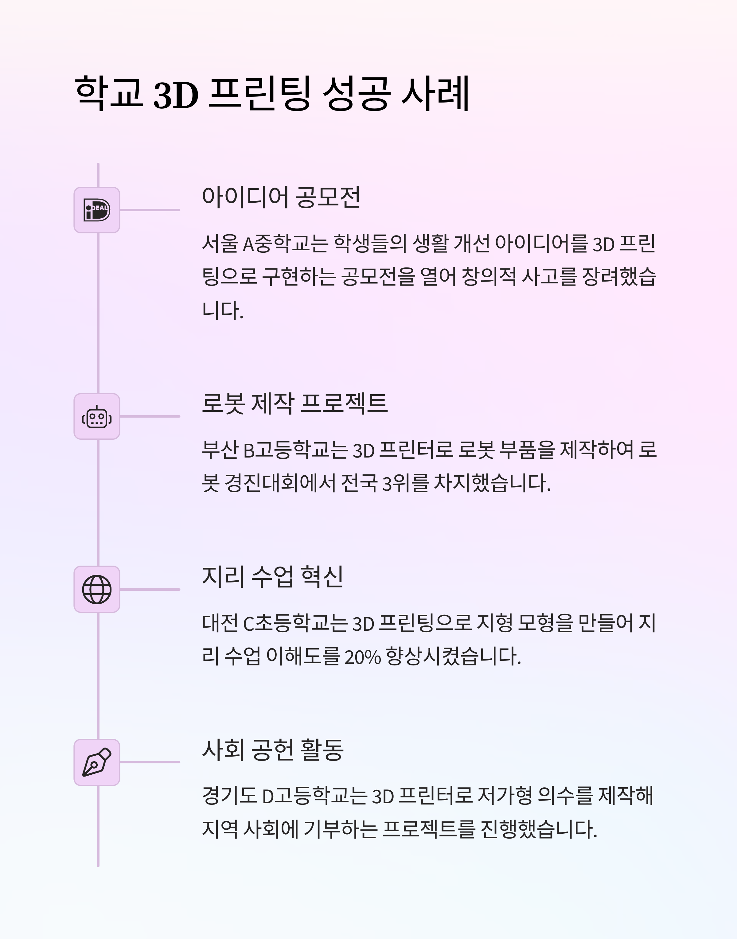 서울 A중학교는 학생들의 생활 개선 아이디어를 3D 프린팅으로 구현하는 공모전을 열어 창의적 사고를 장려했습니다.