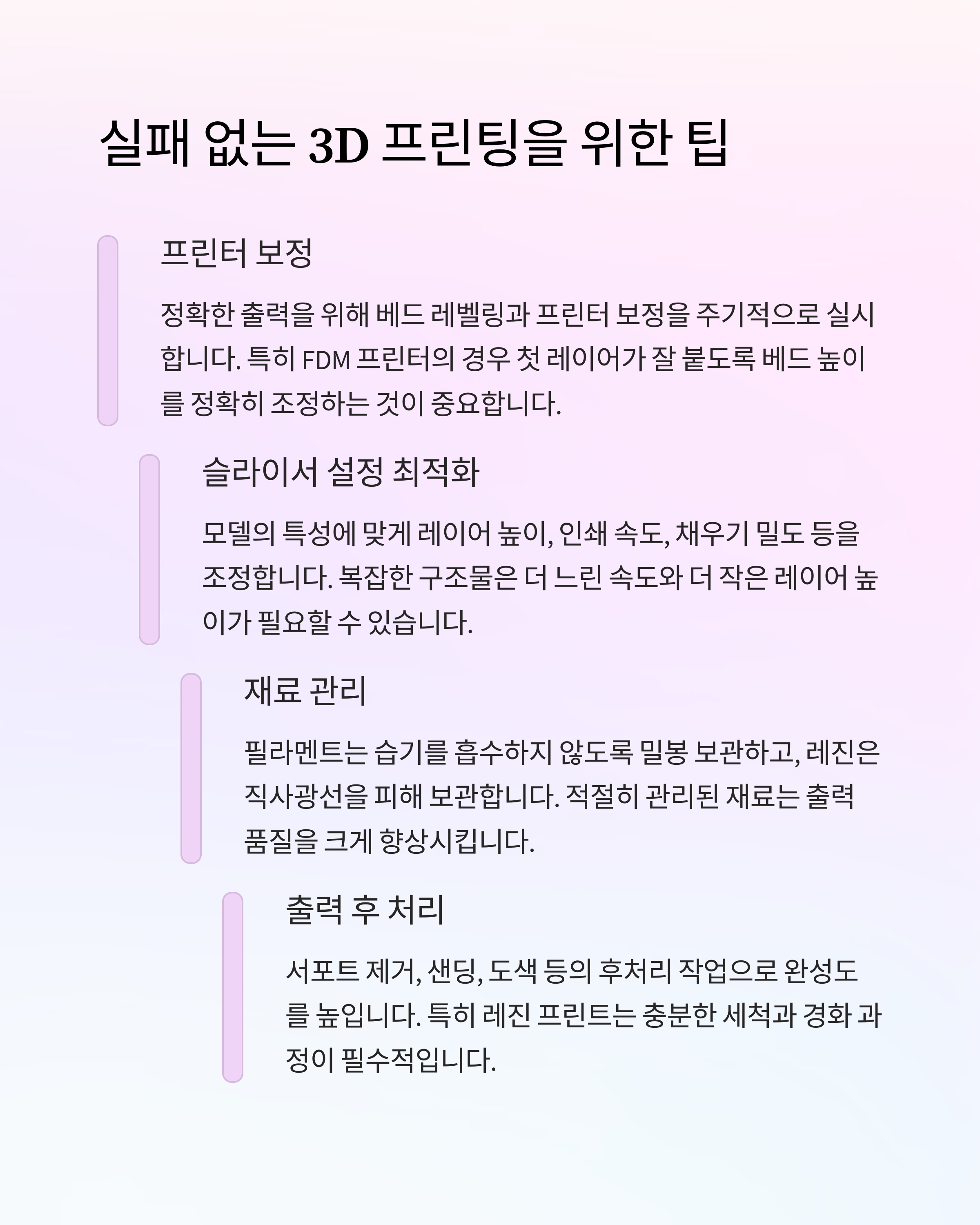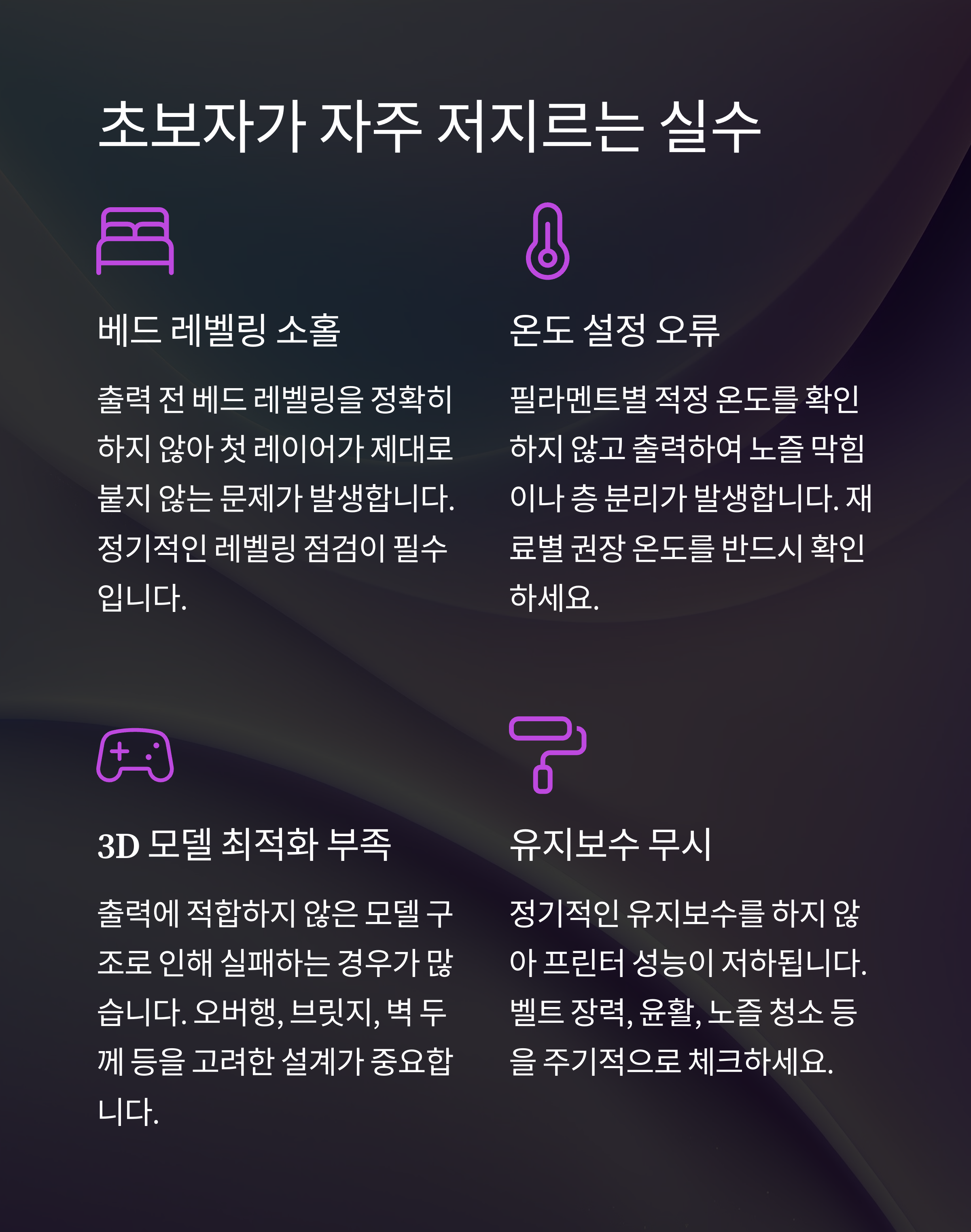 출력에 적합하지 않은 모델 구조로 인해 실패하는 경우가 많습니다. 오버행, 브릿지, 벽 두께 등을 고려한 설계가 중요합니다.