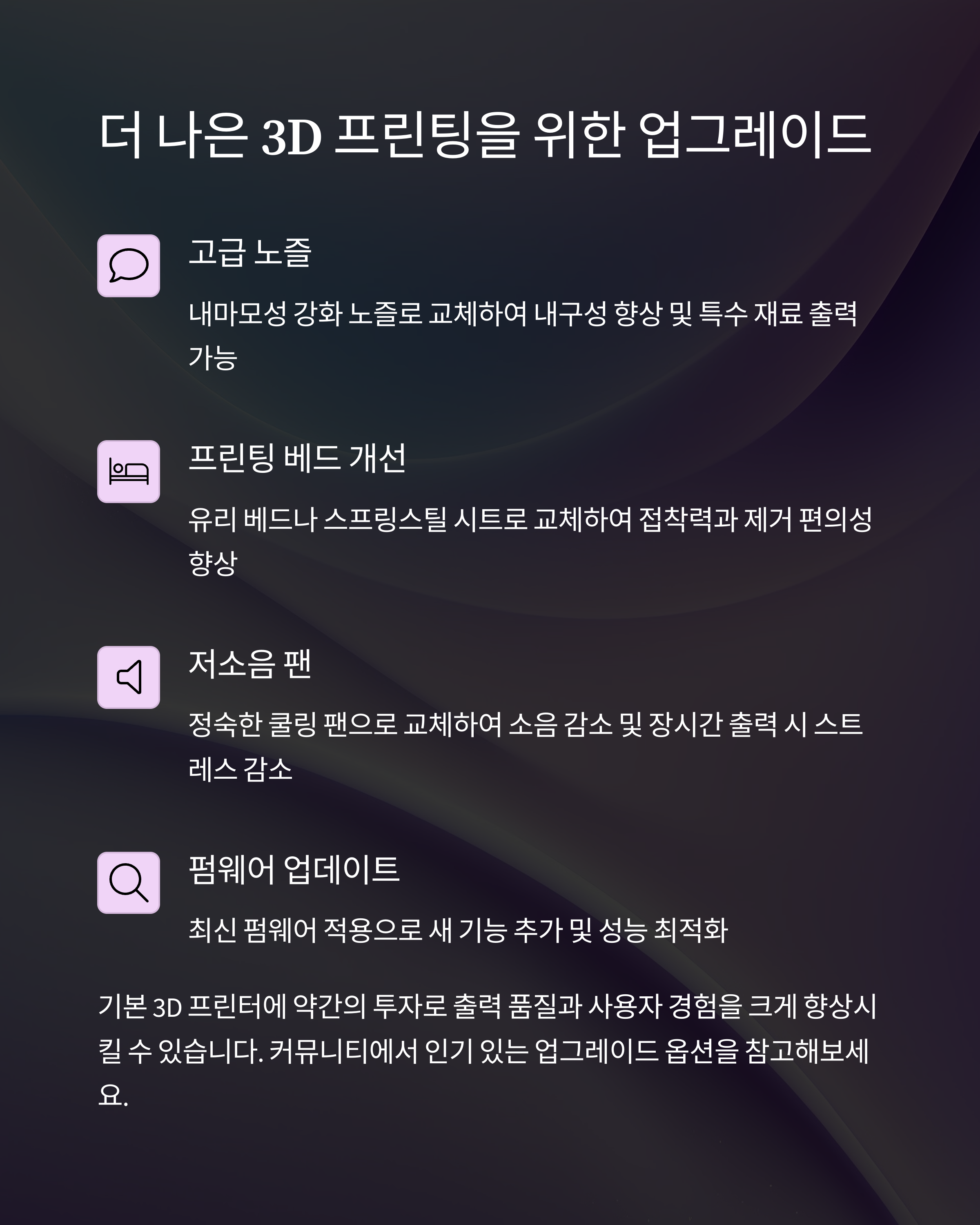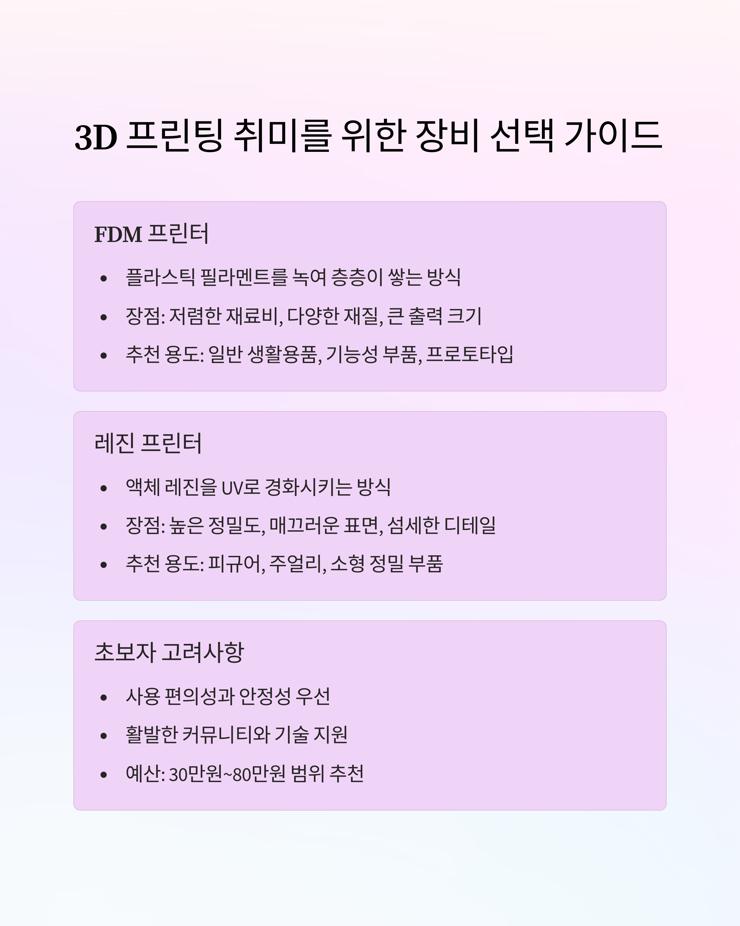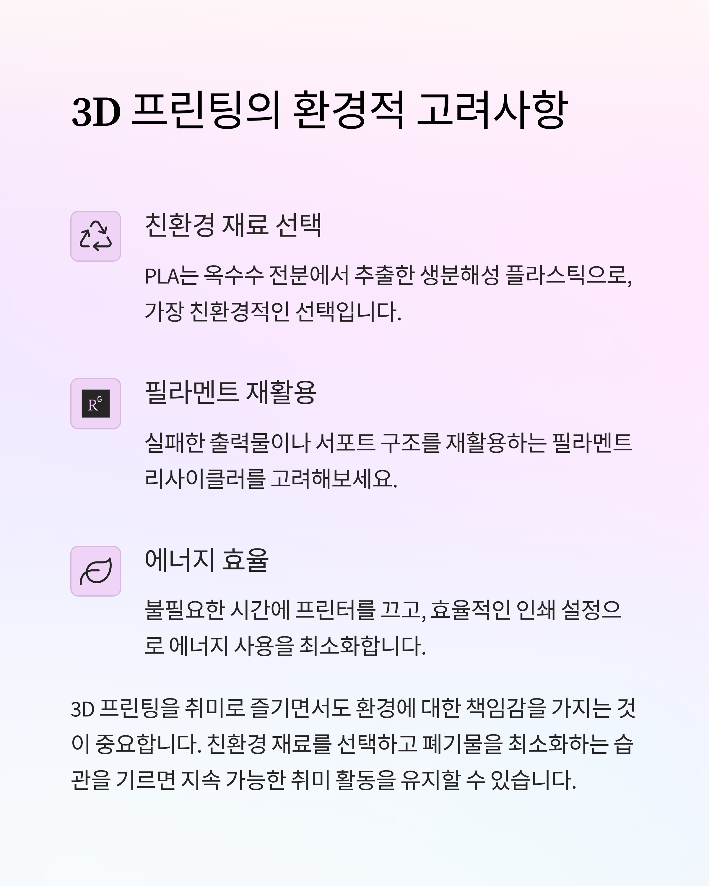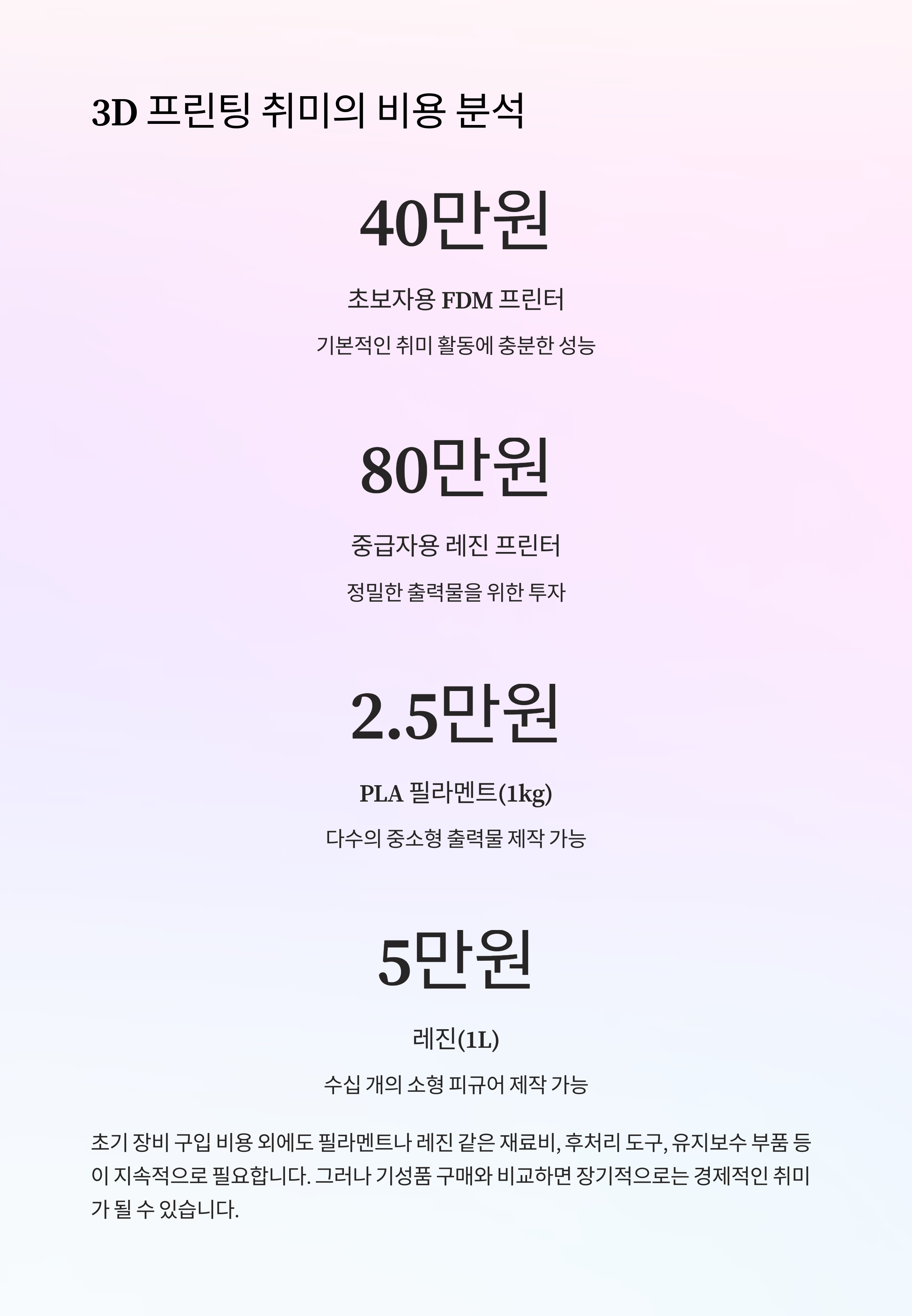 3D 프린팅은 단순한 기술 습득을 넘어 4차 산업혁명 시대에 필요한 핵심 역량을 키울 수 있는 도구입니다. 교육과 취미 활동을 통해 미래를 준비하는 메이커가 되어보세요.