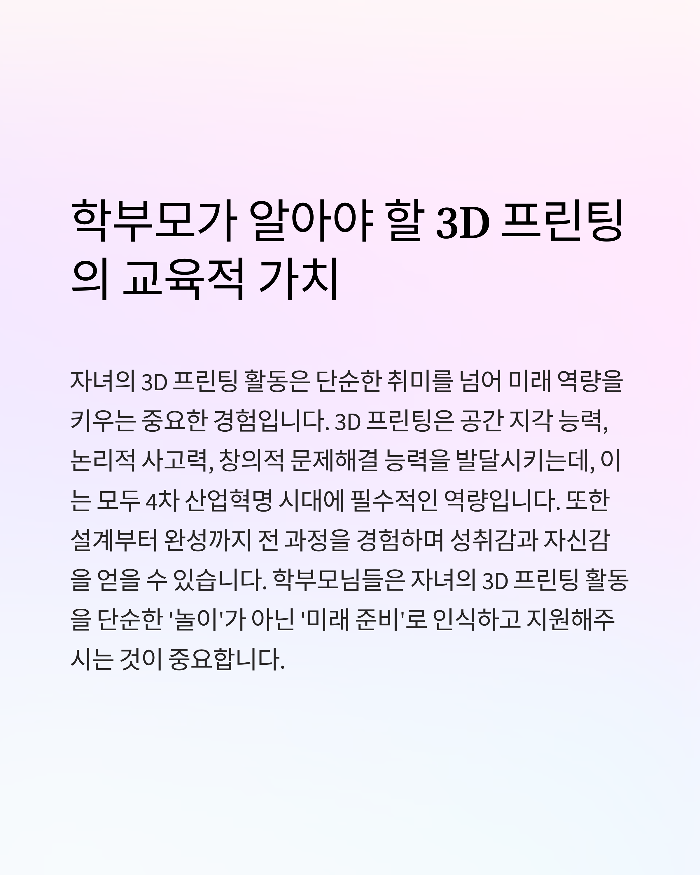 자녀의 3D 프린팅 활동은 단순한 취미를 넘어 미래 역량을 키우는 중요한 경험입니다. 3D 프린팅은 공간 지각 능력, 논리적 사고력, 창의적 문제해결 능력을 발달시키는데, 이는 모두 4차 산업혁명 시대에 필수적인 역량입니다. 또한 설계부터 완성까지 전 과정을 경험하며 성취감과 자신감을 얻을 수 있습니다. 학부모님들은 자녀의 3D 프린팅 활동을 단순한 '놀이'가 아닌 '미래 준비'로 인식하고 지원해주시는 것이 중요합니다.