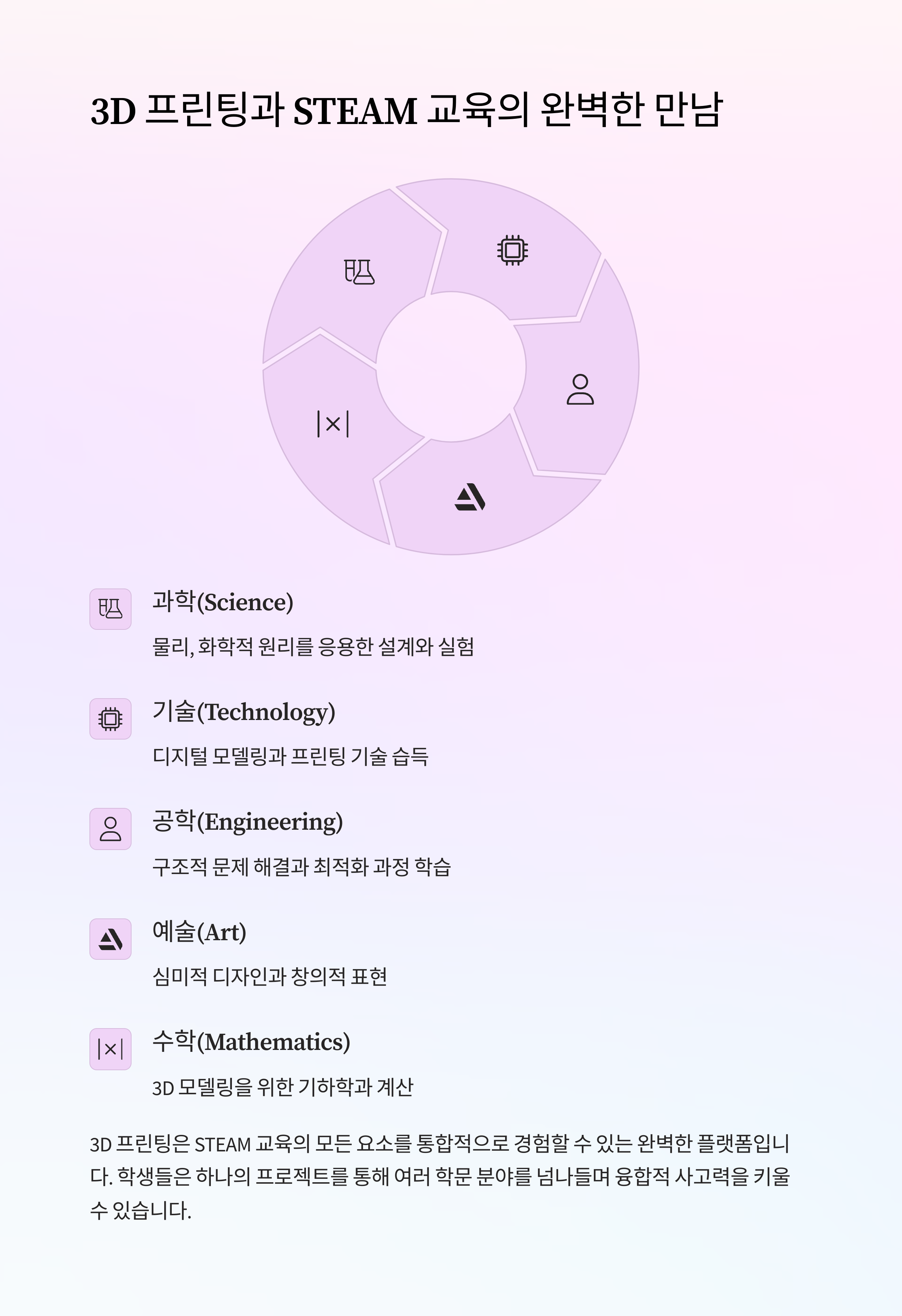 3D 프린팅은 STEAM 교육의 모든 요소를 통합적으로 경험할 수 있는 완벽한 플랫폼입니다. 학생들은 하나의 프로젝트를 통해 여러 학문 분야를 넘나들며 융합적 사고력을 키울 수 있습니다.