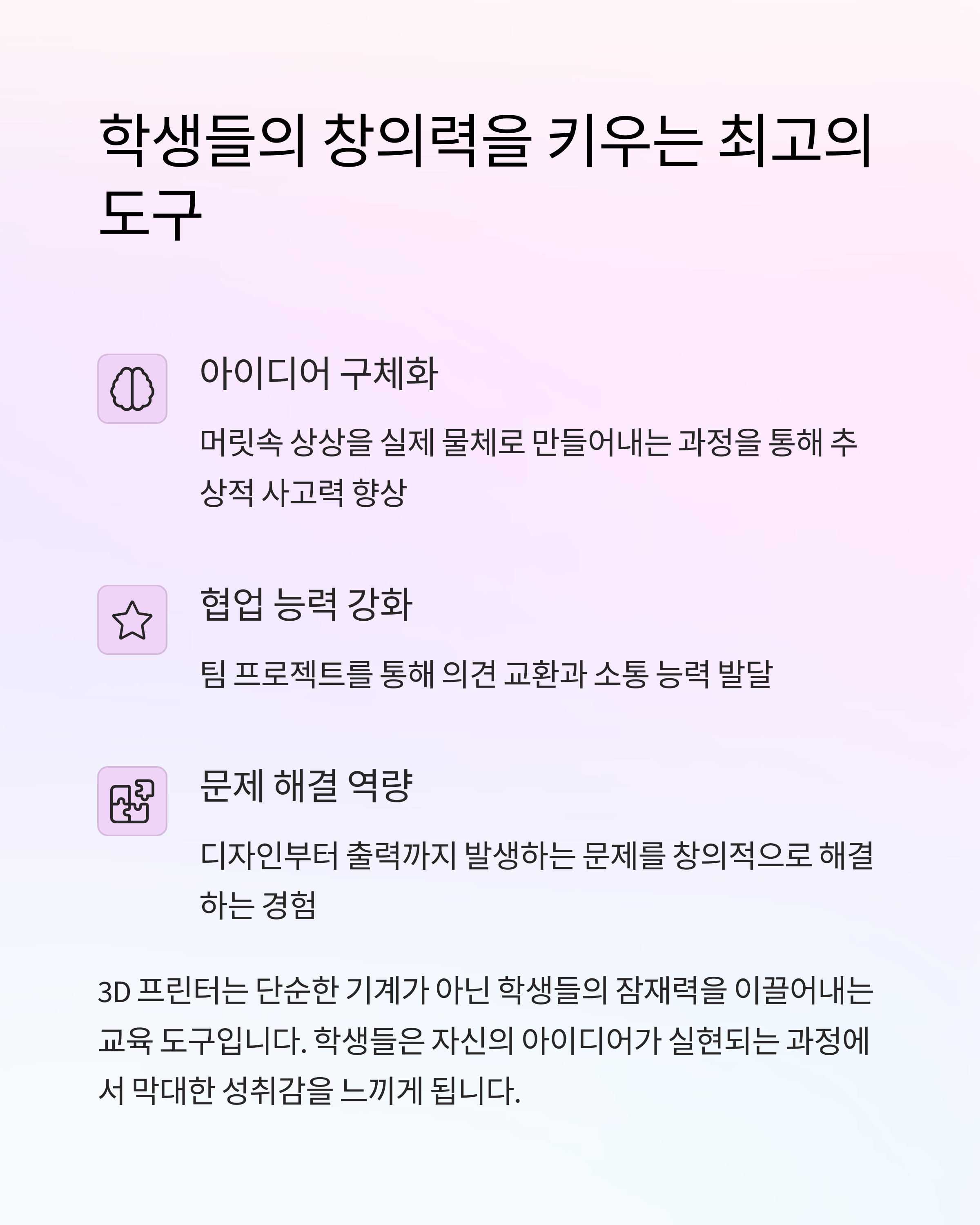 3D 프린터는 단순한 기계가 아닌 학생들의 잠재력을 이끌어내는 교육 도구입니다. 학생들은 자신의 아이디어가 실현되는 과정에서 막대한 성취감을 느끼게 됩니다.