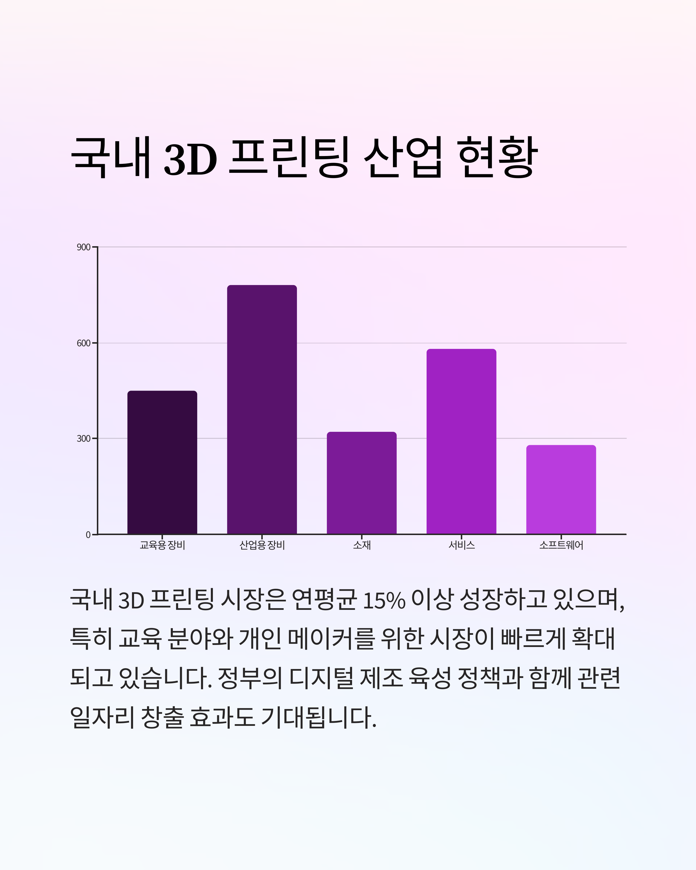 국내 3D 프린팅 시장은 연평균 15% 이상 성장하고 있으며, 특히 교육 분야와 개인 메이커를 위한 시장이 빠르게 확대되고 있습니다. 정부의 디지털 제조 육성 정책과 함께 관련 일자리 창출 효과도 기대됩니다.