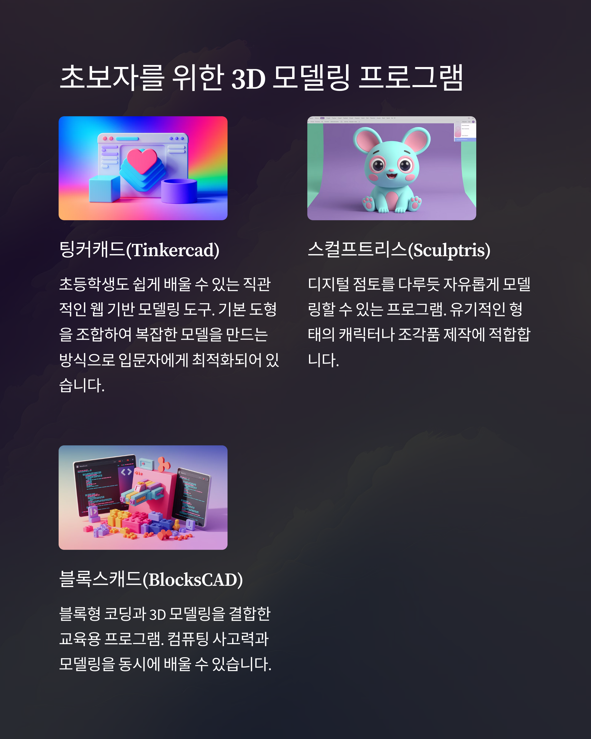 블록형 코딩과 3D 모델링을 결합한 교육용 프로그램. 컴퓨팅 사고력과 모델링을 동시에 배울 수 있습니다.