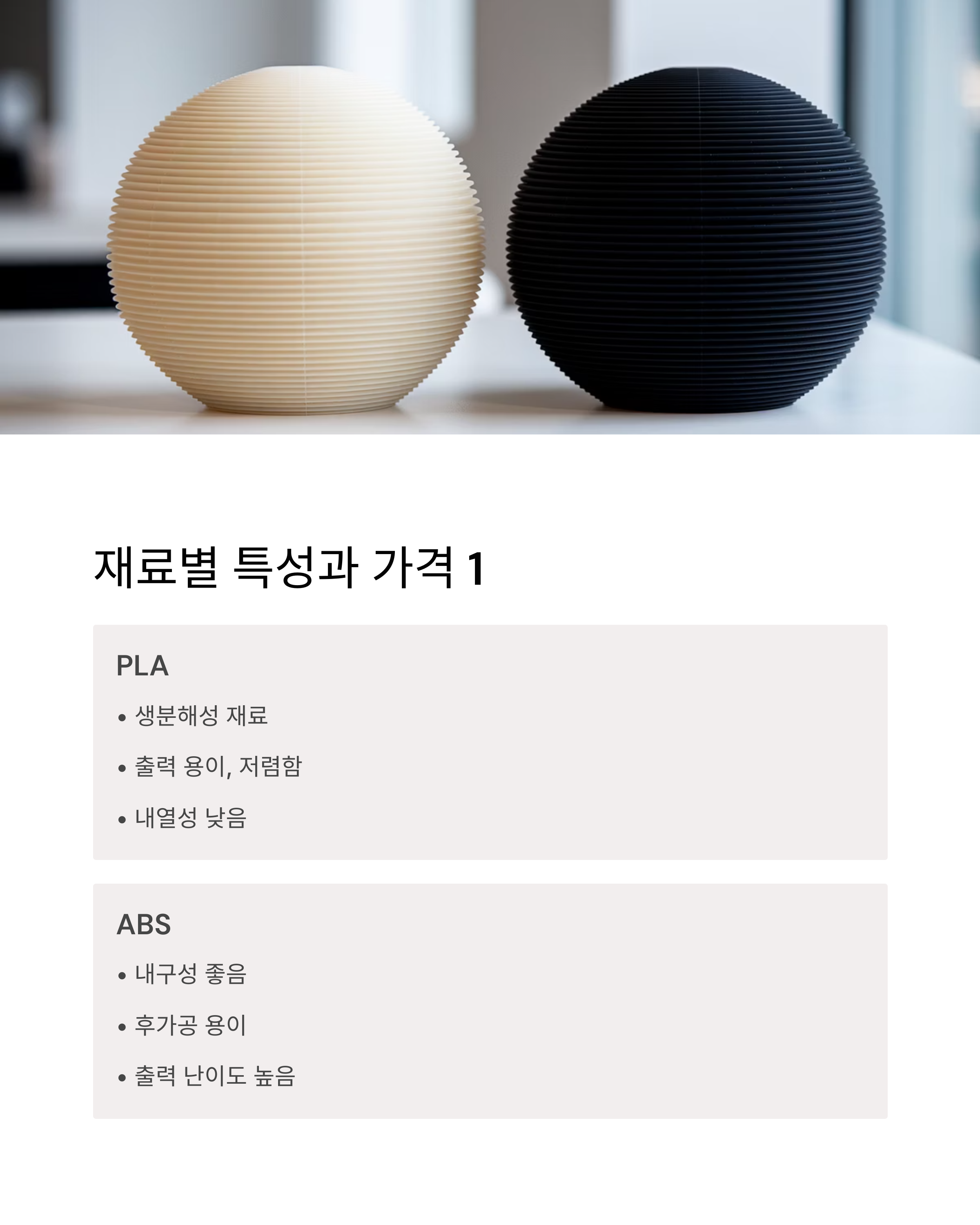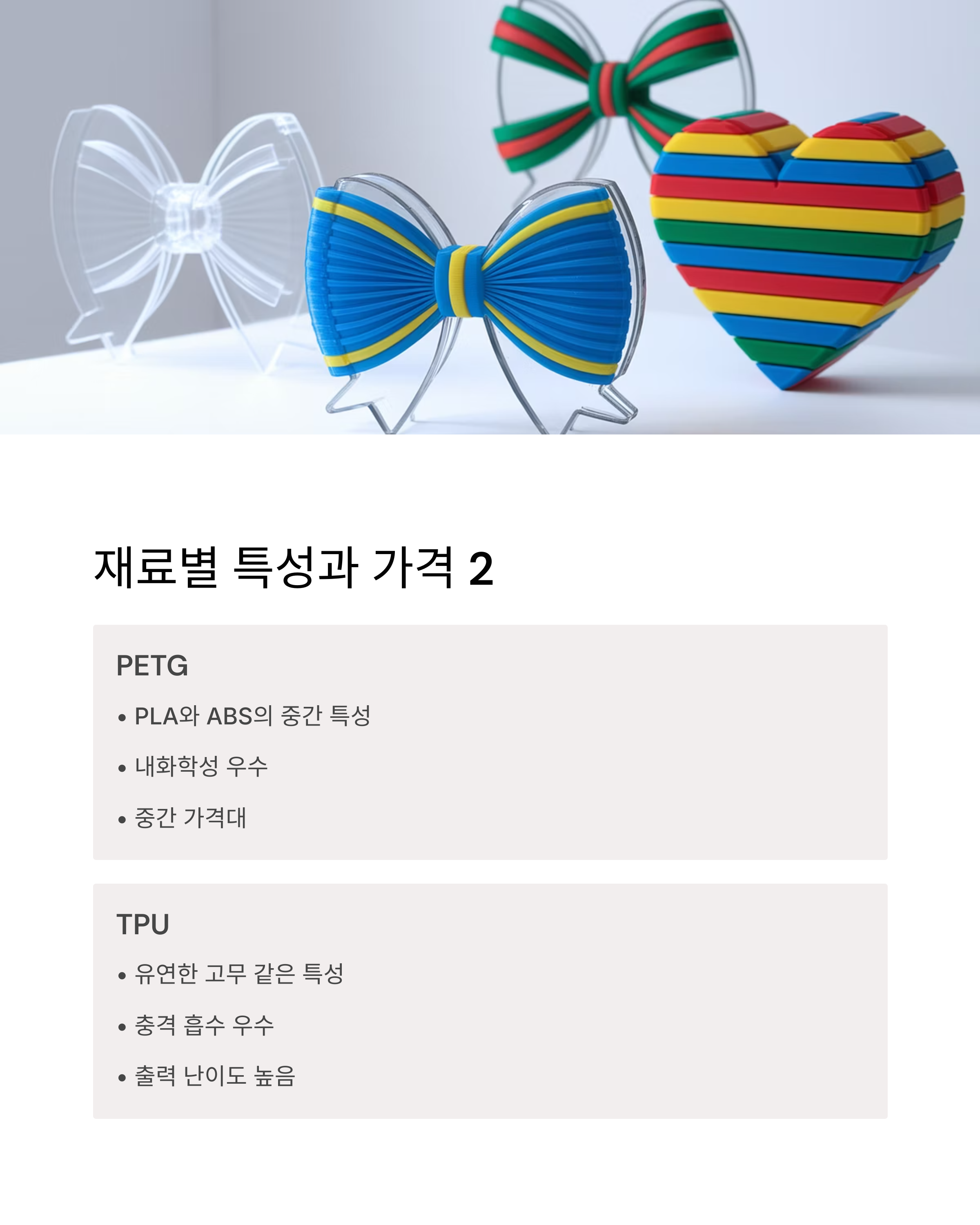 PLA, ABS, PETG, TPU, 레진 등 재료별 단가 차이