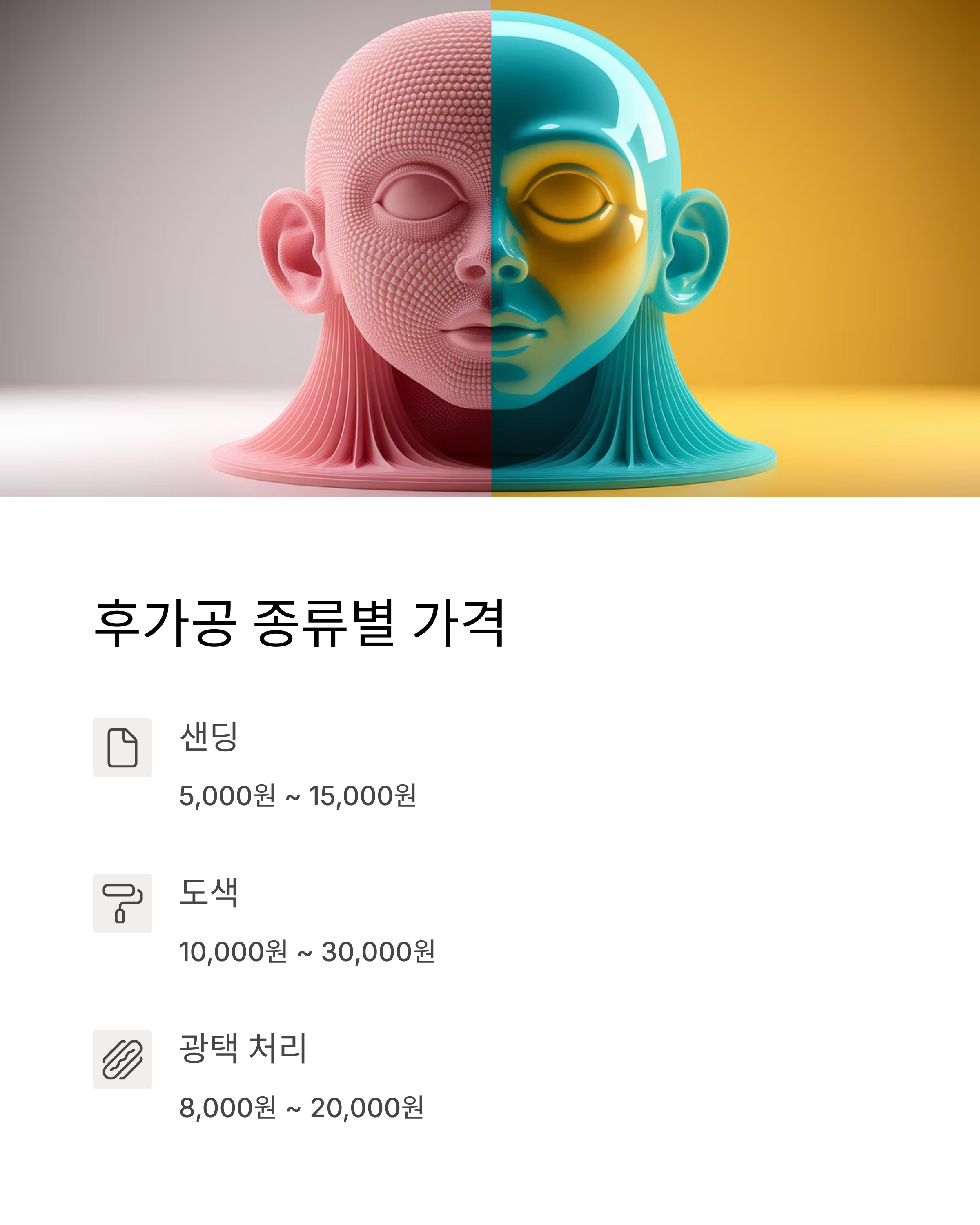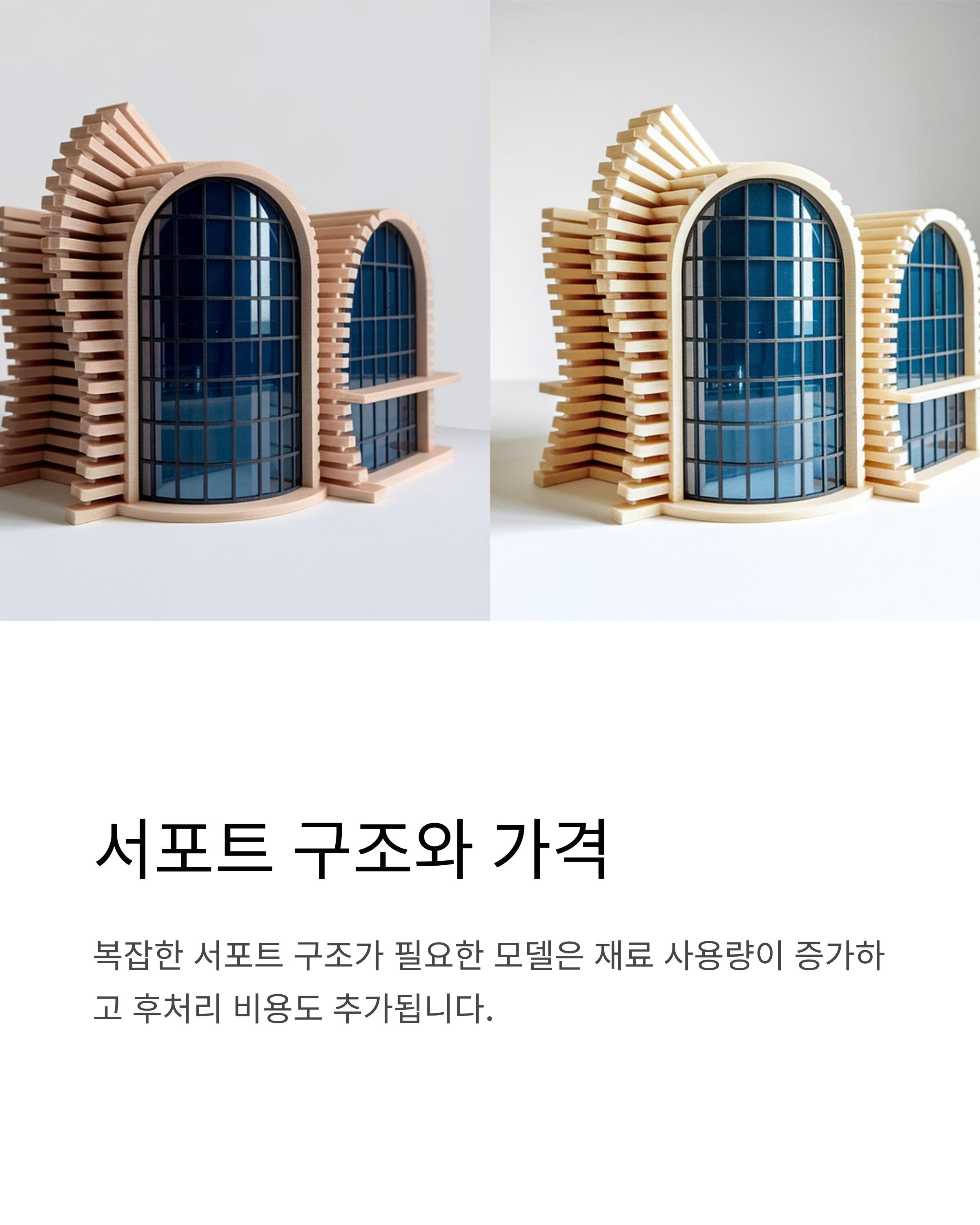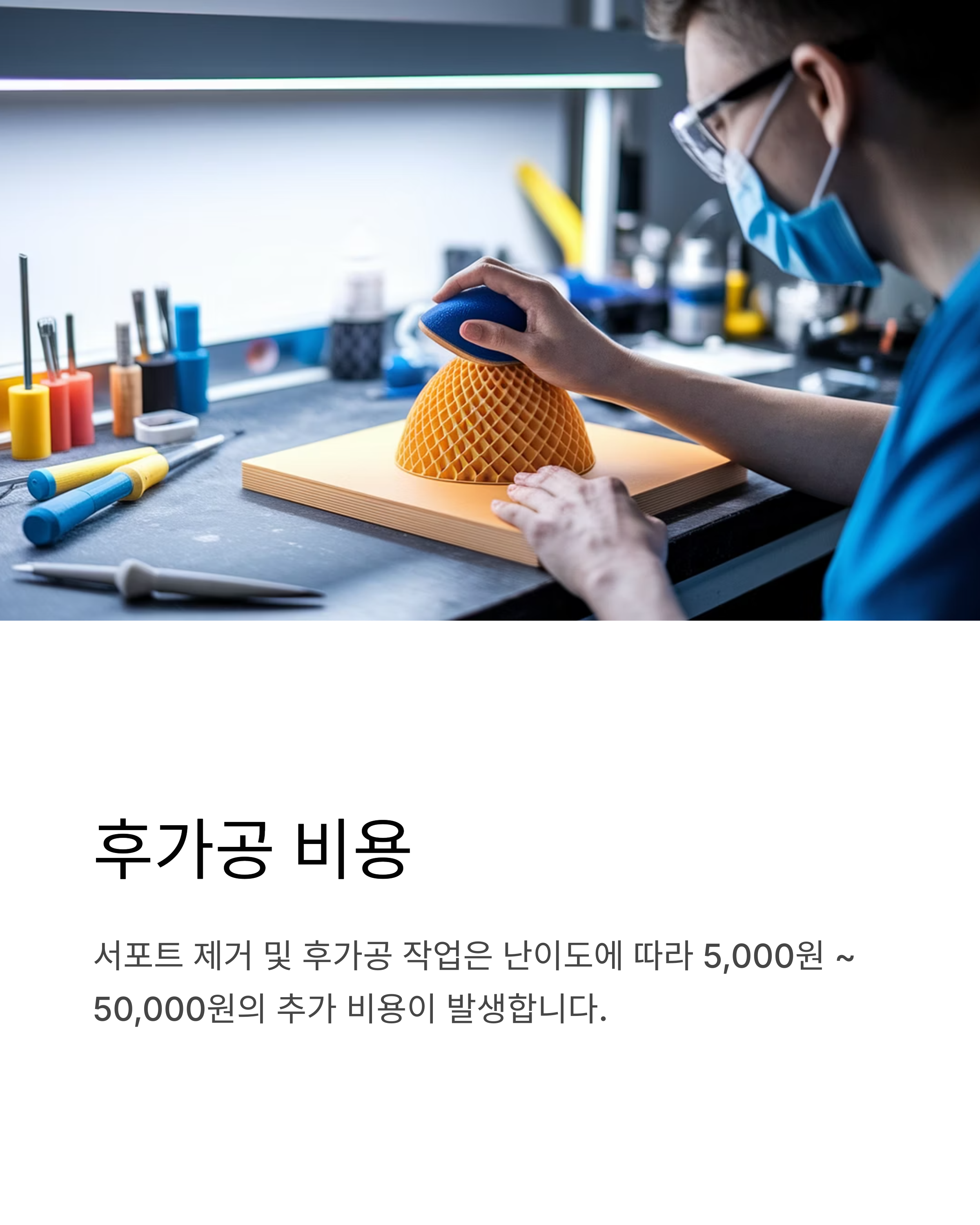 서포트 제거 및 후가공 작업은 난이도에 따라 5,000원 ~ 50,000원의 추가 비용이 발생합니다.