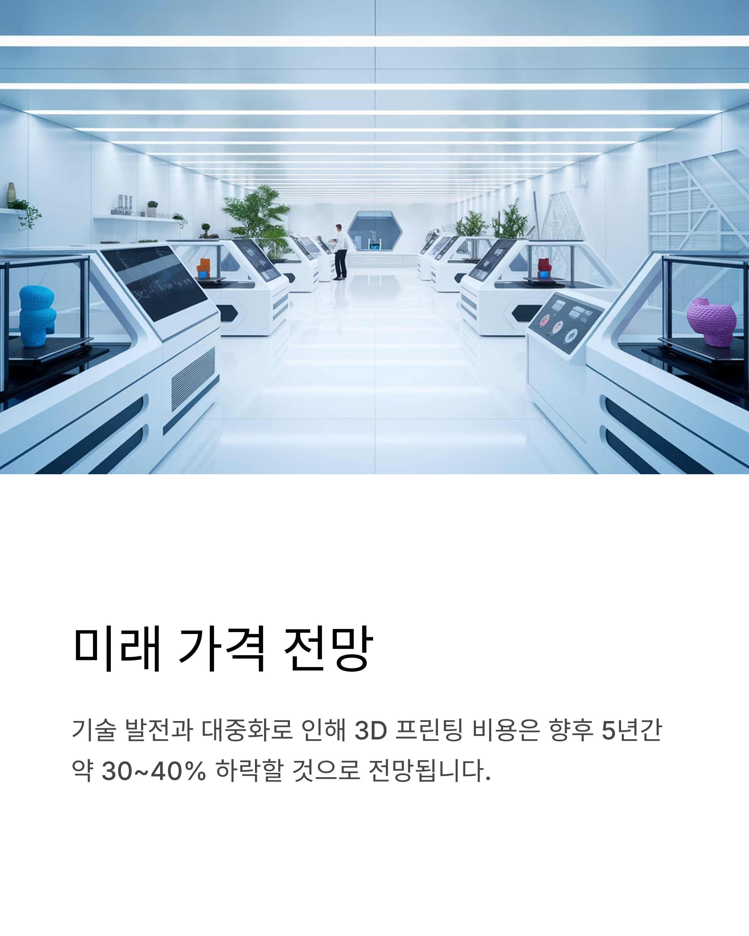기술 발전과 대중화로 인해 3D 프린팅 비용은 향후 5년간 약 30~40% 하락할 것으로 전망됩니다.