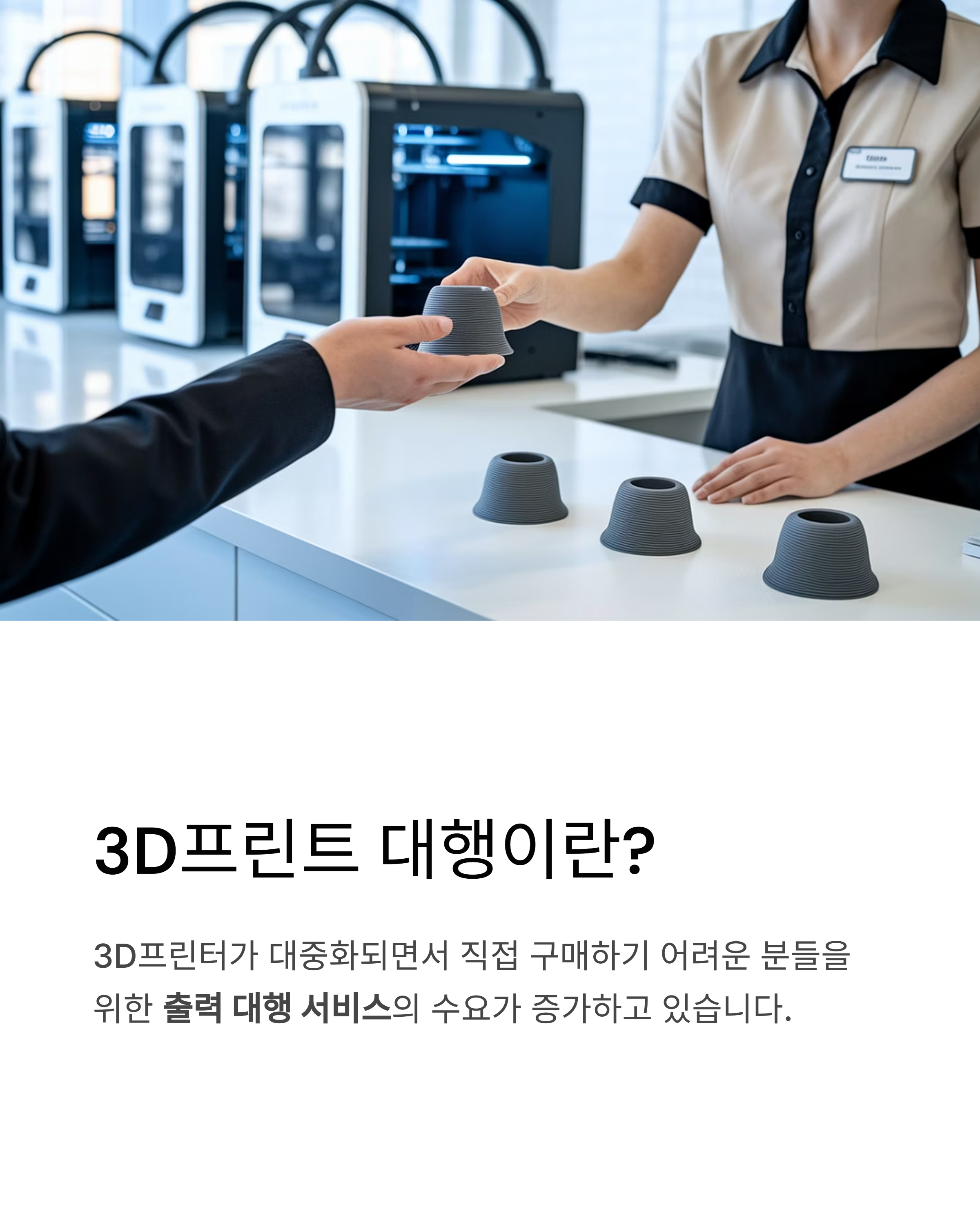 3D프린터가 대중화되면서 직접 구매하기 어려운 분들을 위한 출력 대행 서비스의 수요가 증가하고 있습니다.