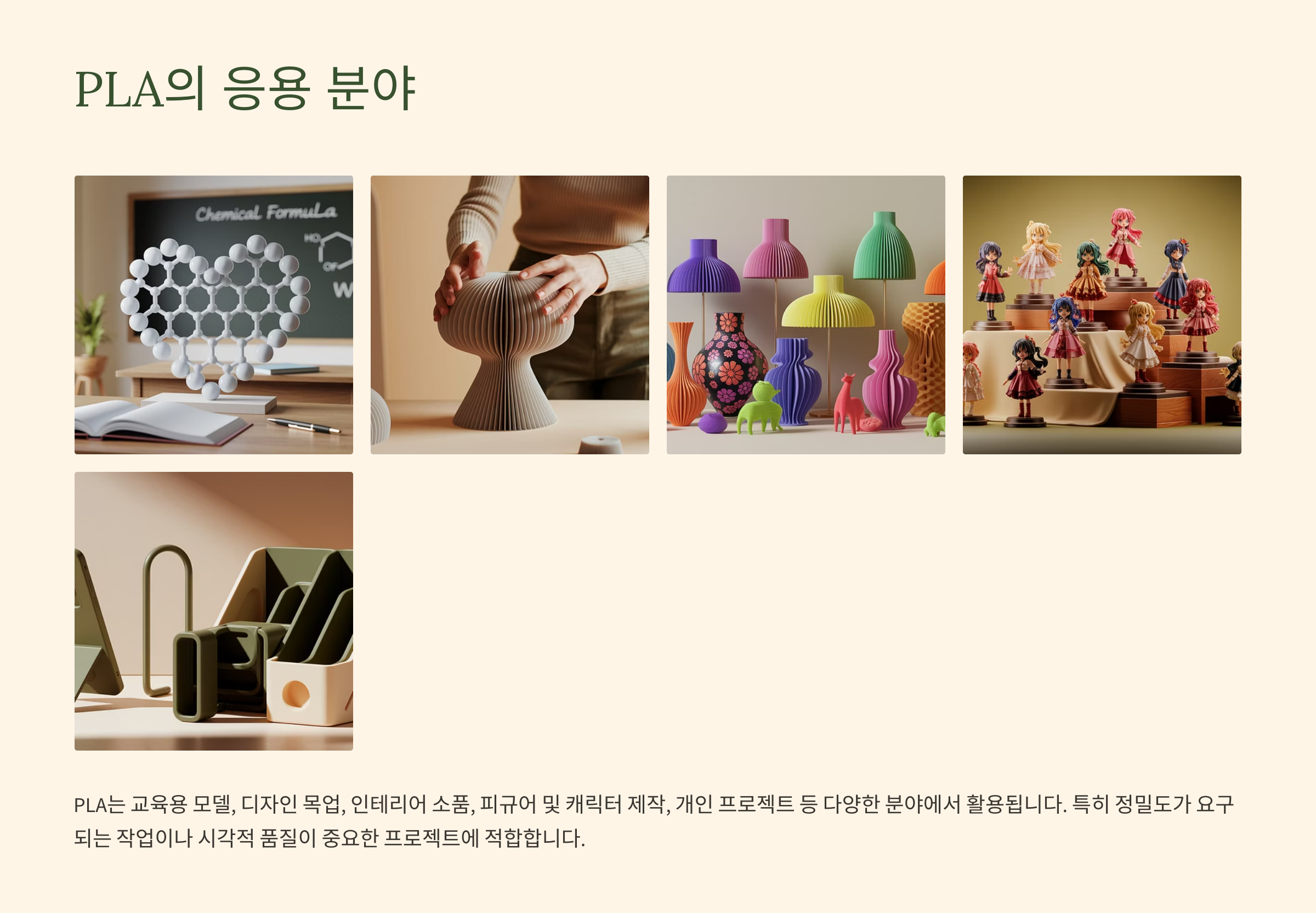 PLA는 교육용 모델, 디자인 목업, 인테리어 소품, 피규어 및 캐릭터 제작, 개인 프로젝트 등 다양한 분야에서 활용됩니다. 특히 정밀도가 요구되는 작업이나 시각적 품질이 중요한 프로젝트에 적합합니다.