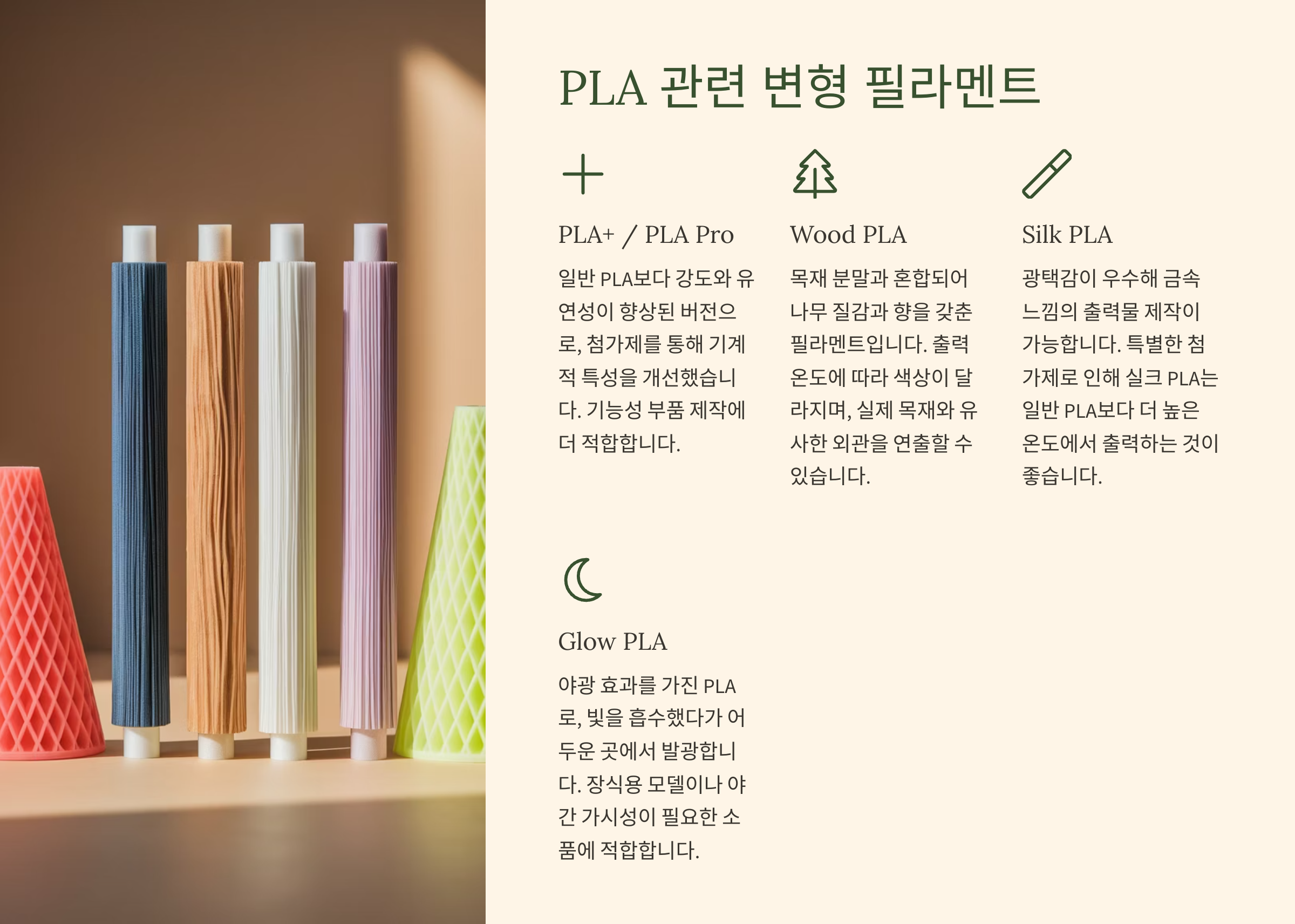 기본 PLA 외에도 투명, 무광, 반짝이, 대리석, 목재 질감 등 다양한 특수 효과를 가진 필라멘트가 있어 풍부한 표현이 가능합니다.