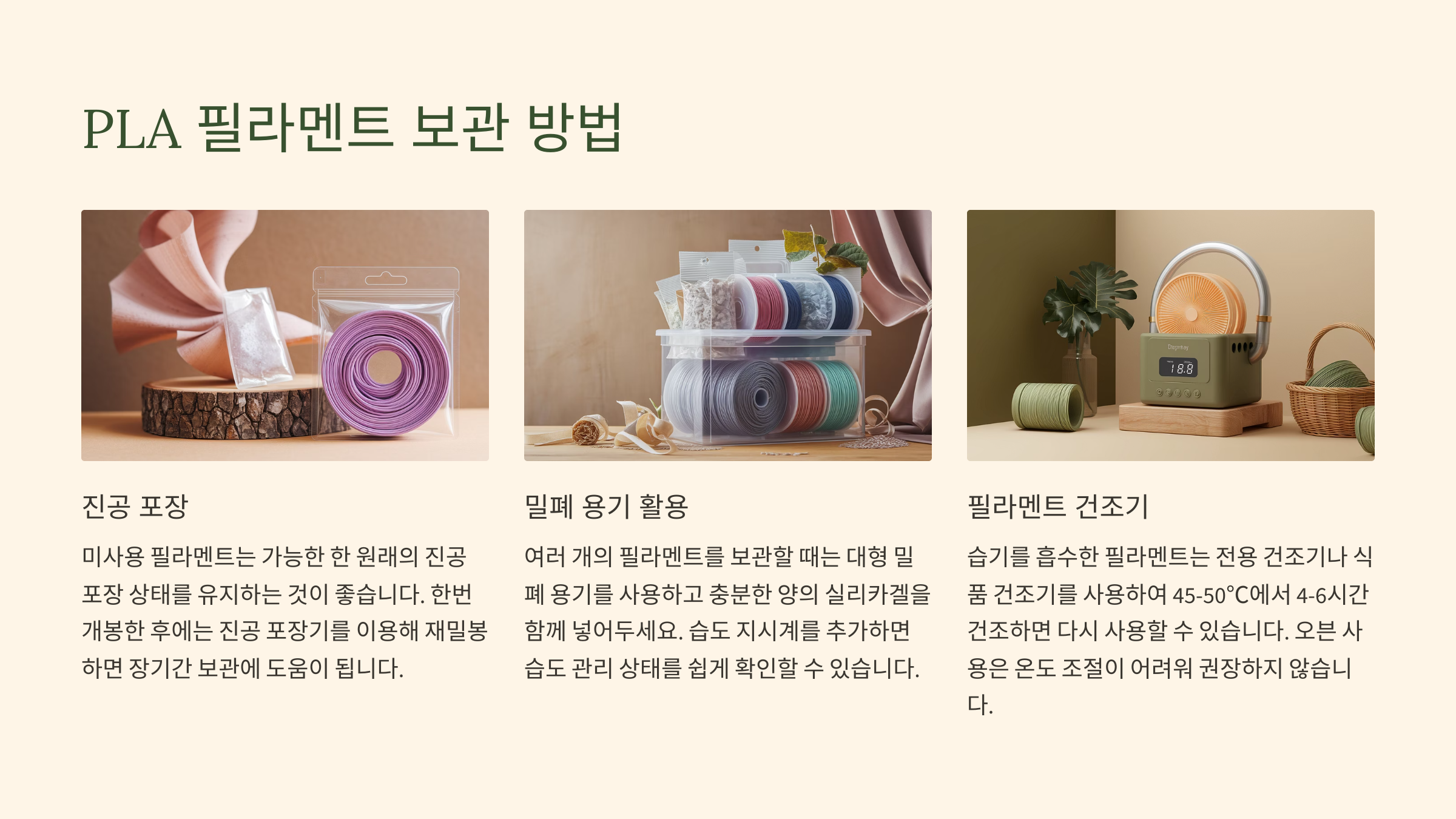 습기에 노출될 경우 필라멘트가 수분을 흡수해 출력 품질이 저하되고 제품 수명이 단축됩니다.