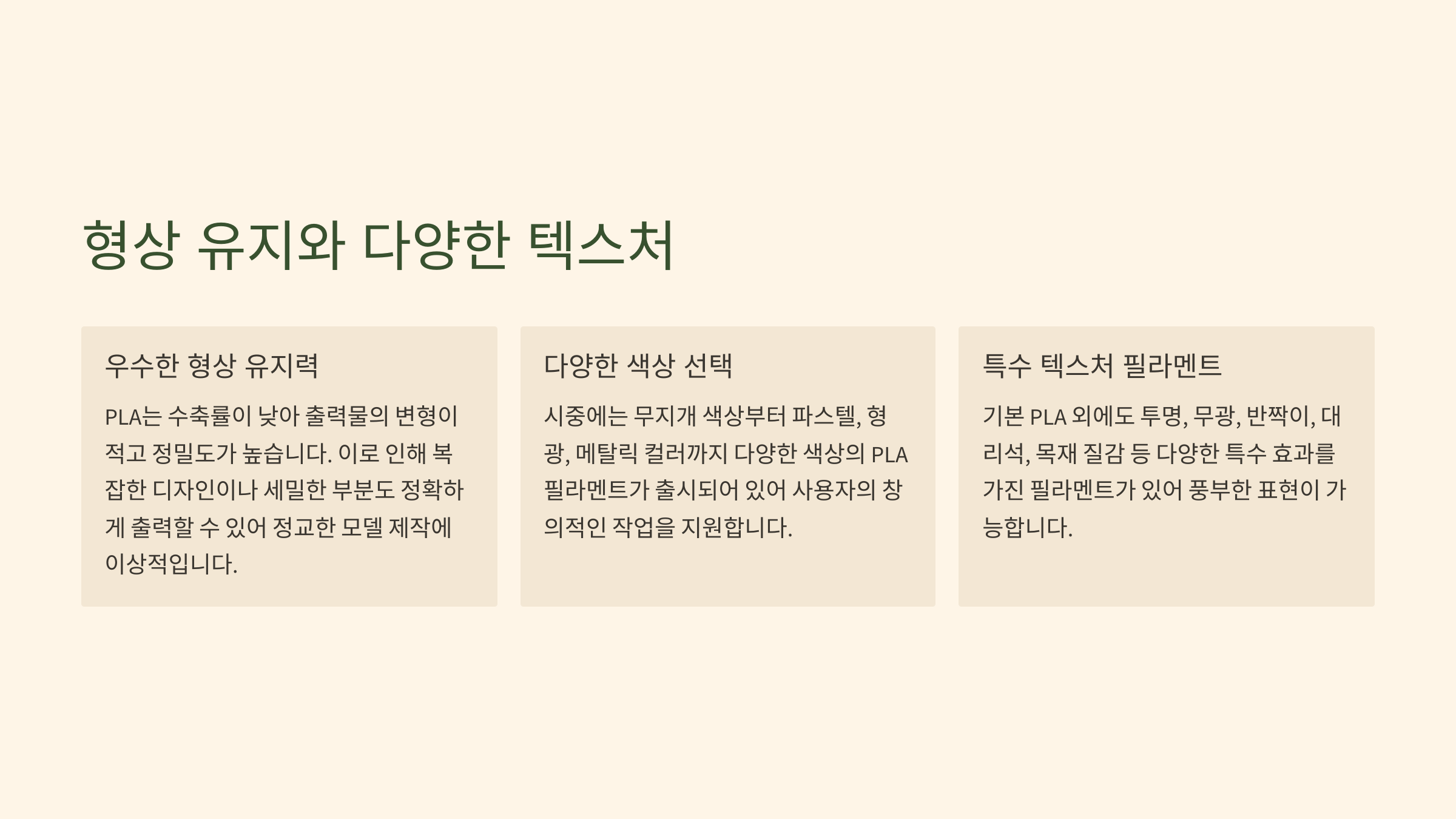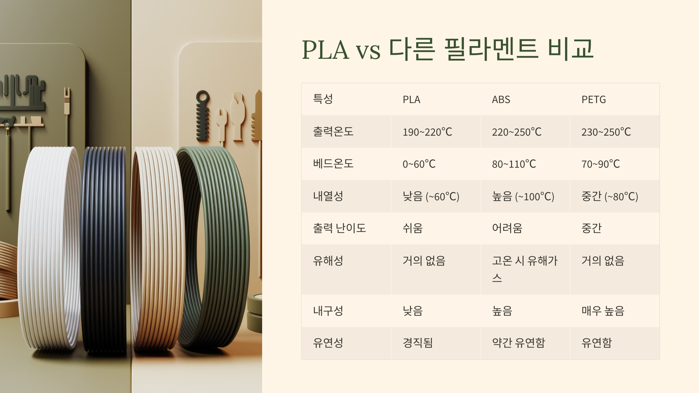 | 특성 | PLA | ABS | PETG |