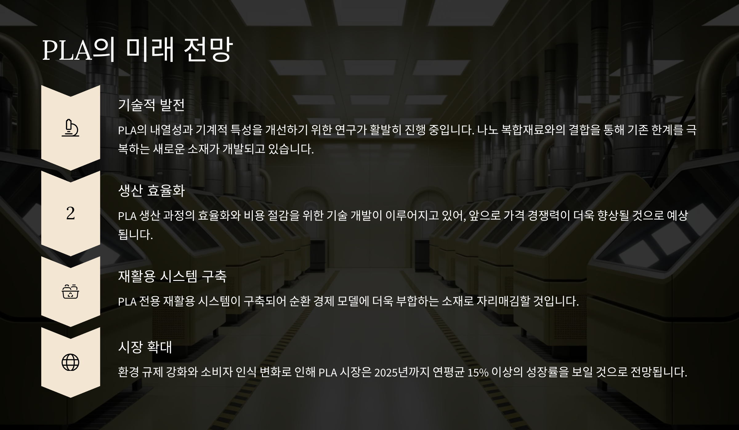 PLA 생산 과정의 효율화와 비용 절감을 위한 기술 개발이 이루어지고 있어, 앞으로 가격 경쟁력이 더욱 향상될 것으로 예상됩니다.