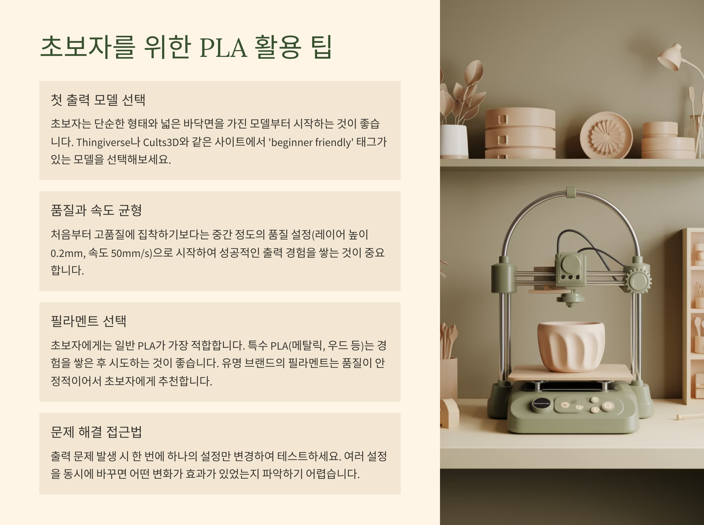 초보자에게는 일반 PLA가 가장 적합합니다. 특수 PLA(메탈릭, 우드 등)는 경험을 쌓은 후 시도하는 것이 좋습니다. 유명 브랜드의 필라멘트는 품질이 안정적이어서 초보자에게 추천합니다.