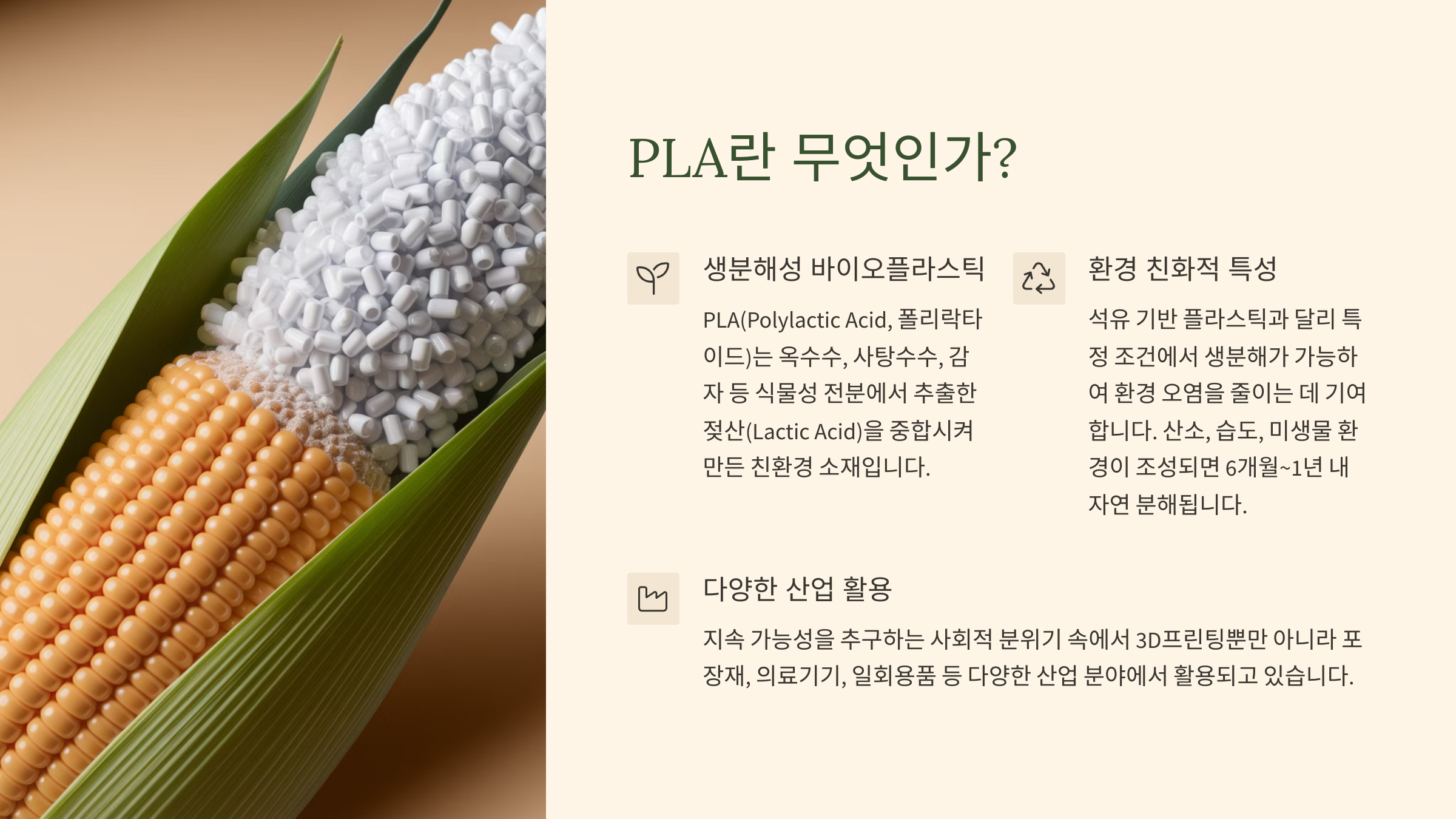 PLA(Polylactic Acid, 폴리락타이드)는 옥수수, 사탕수수, 감자 등 식물성 전분에서 추출한 젖산(Lactic Acid)을 중합시켜 만든 친환경 소재입니다.