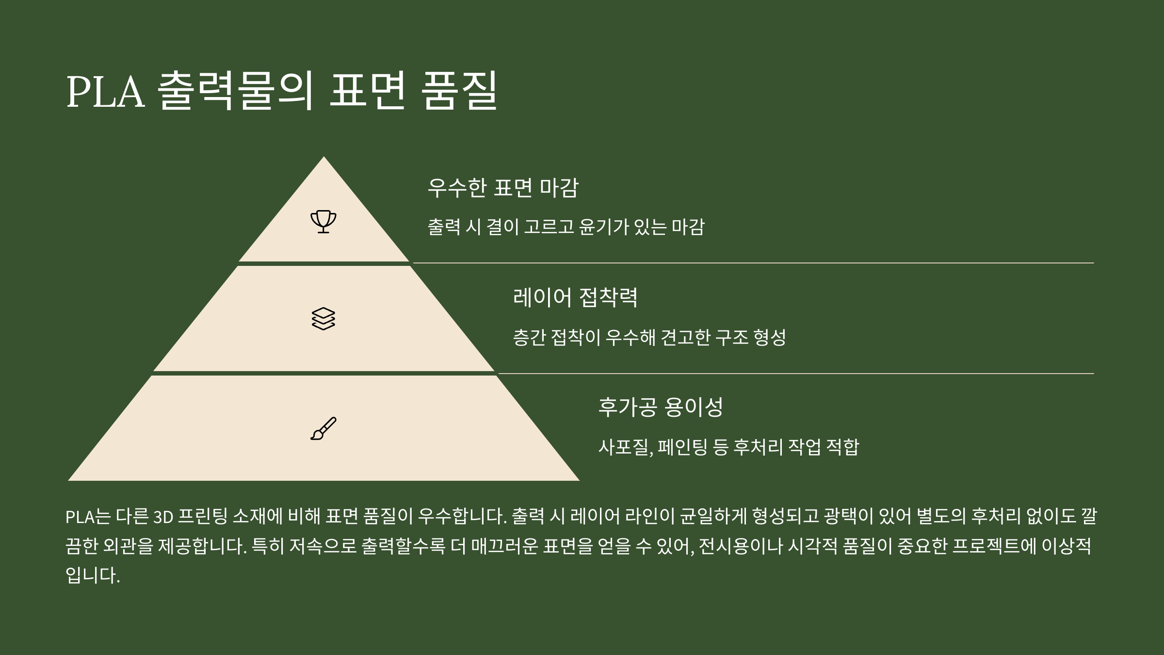 PLA는 다른 3D 프린팅 소재에 비해 표면 품질이 우수합니다. 출력 시 레이어 라인이 균일하게 형성되고 광택이 있어 별도의 후처리 없이도 깔끔한 외관을 제공합니다. 특히 저속으로 출력할수록 더 매끄러운 표면을 얻을 수 있어, 전시용이나 시각적 품질이 중요한 프로젝트에 이상적입니다.