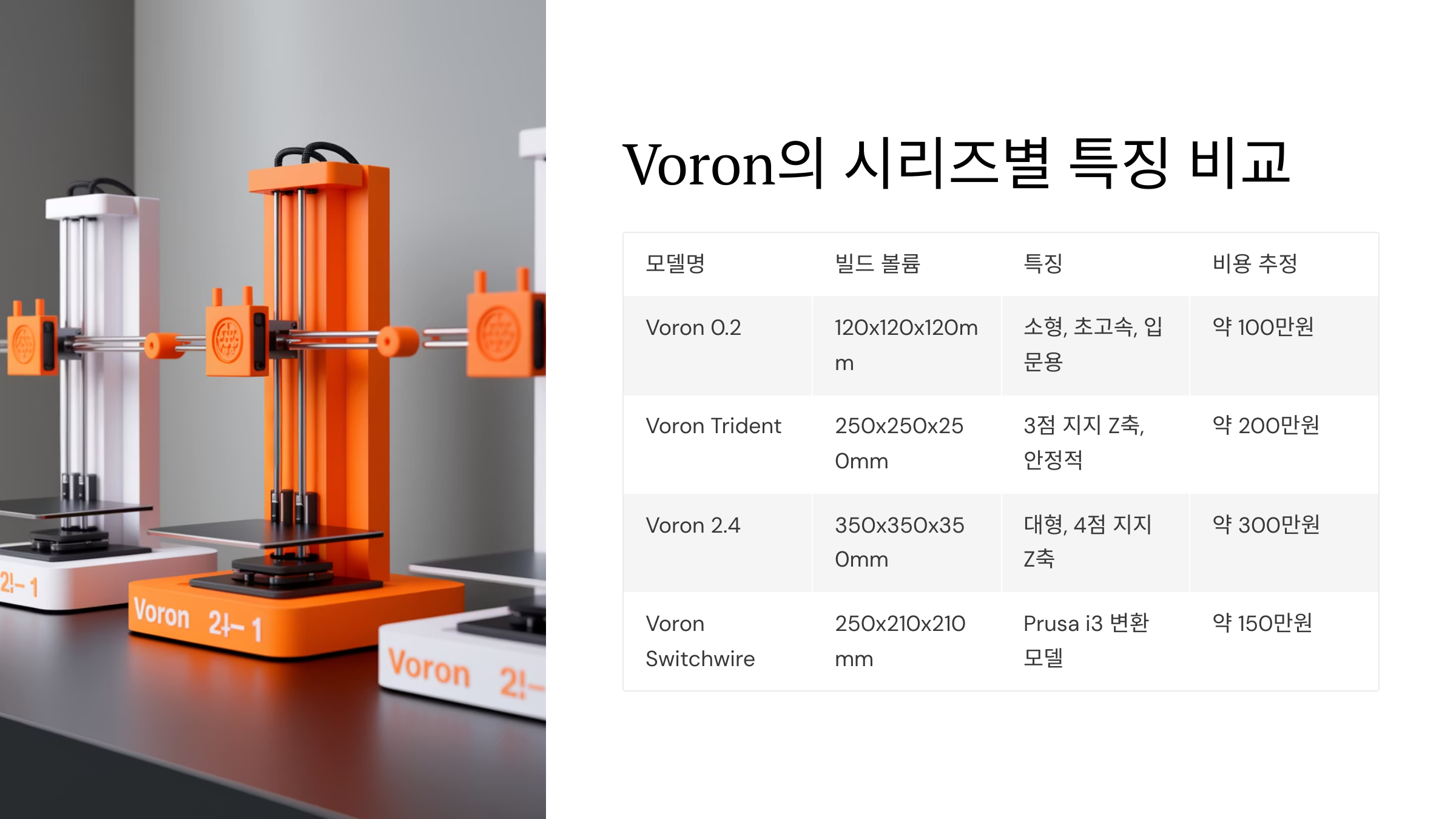 | Voron 0.2 | 120x120x120mm | 소형, 초고속, 입문용 | 약 100만원 |