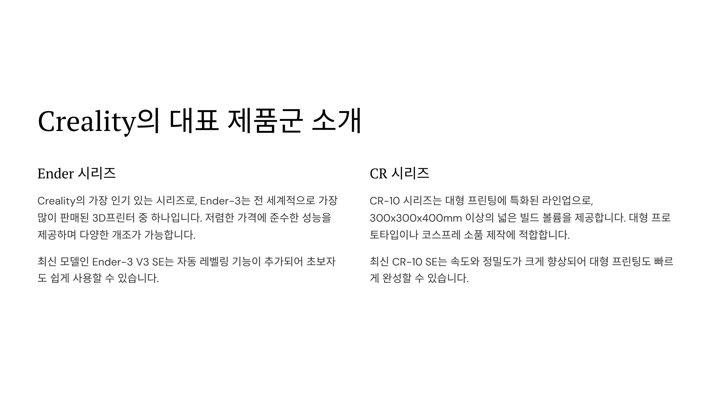 CR-10 시리즈는 대형 프린팅에 특화된 라인업으로, 300x300x400mm 이상의 넓은 빌드 볼륨을 제공합니다. 대형 프로토타입이나 코스프레 소품 제작에 적합합니다.