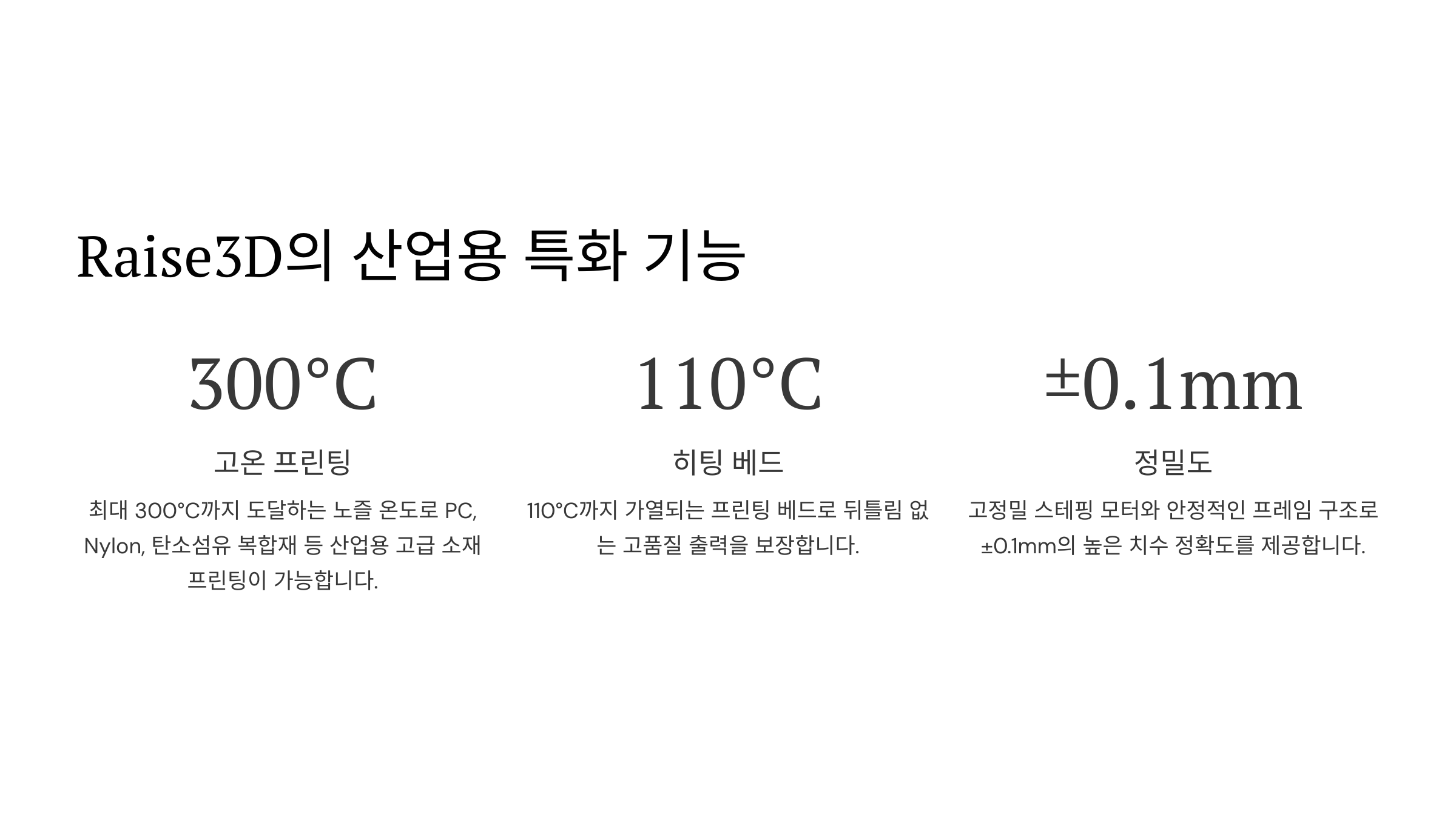 Raise3D 프린터는 24/7 연속 가동을 고려한 설계로, 기계적 내구성과 안정성이 뛰어납니다. 금속 프레임과 고급 부품을 사용하여 장기간 사용해도 성능 저하가 적습니다.