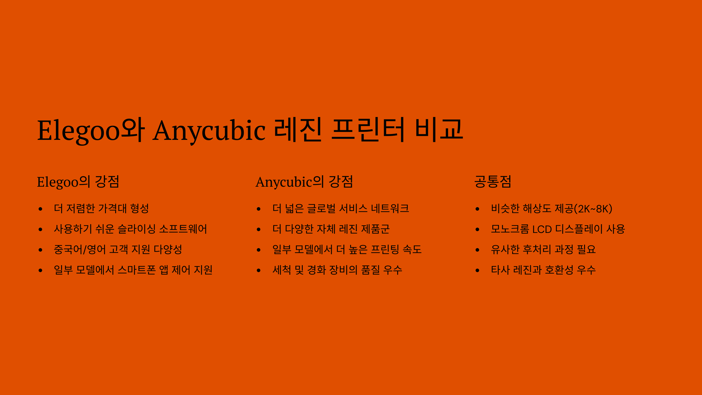 Elegoo는 동급 사양 대비 더 저렴한 가격으로 인기를 얻고 있습니다. Mars 3 Pro는 4K 해상도를 제공하면서도 경쟁사 대비 15-20% 저렴한 가격에 판매되고 있습니다.