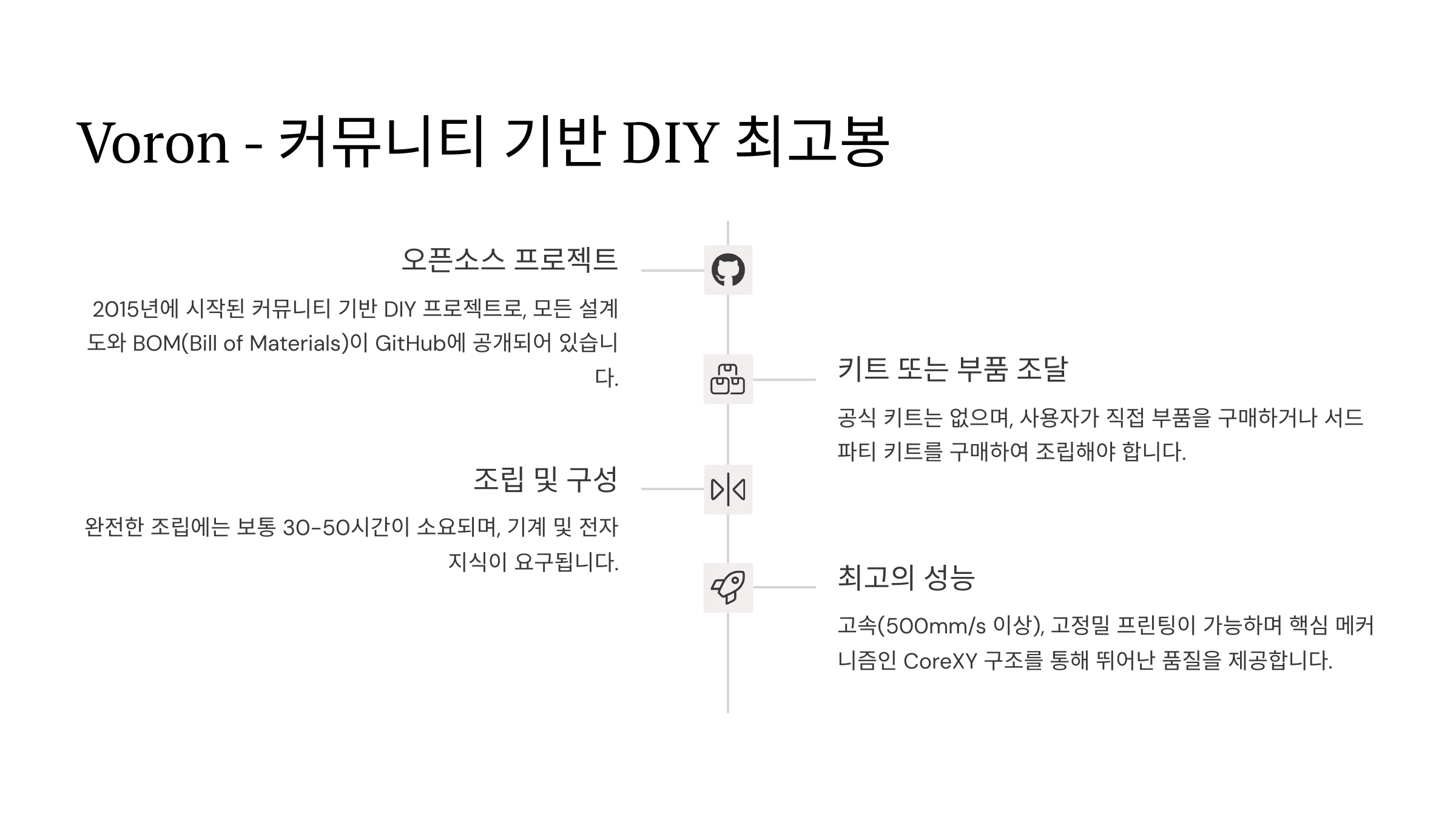 | Voron 2.4 | 350x350x350mm | 대형, 4점 지지 Z축 | 약 300만원 |
