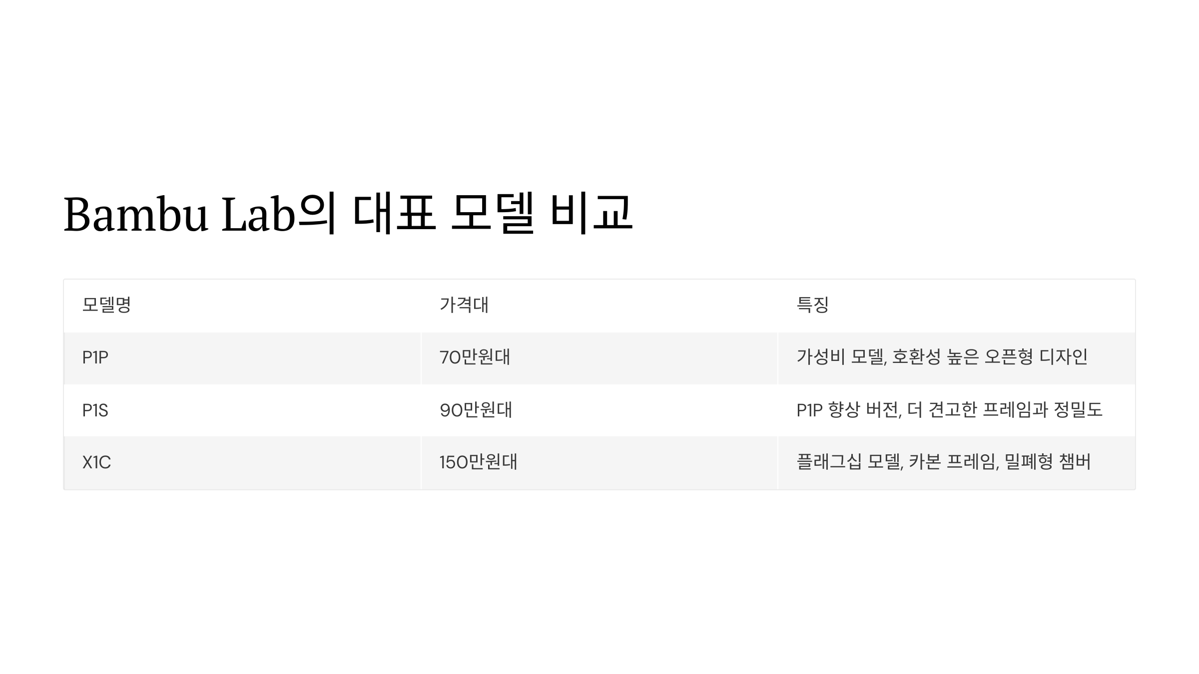 | X1C | 150만원대 | 플래그십 모델, 카본 프레임, 밀폐형 챔버 |
